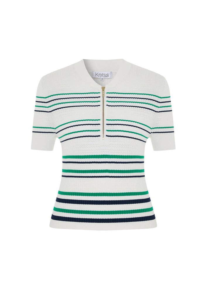 Ekru zemin üzerinde yeşil ve lacivert çizgi detaylarıyla hareket kazanan triko üst, fermuar kapamalı yaka ve ajur örgü dokusuyla modern bir görünüm sunar. Slim fit kalıbı ve kısa kol formu vücuda dengeli bir siluet verirken, fitil örgü yapısı gün boyu konfor sağlar. Dinamik çizgi oyunu, kombinlere enerjik ve rafine bir karakter katar.