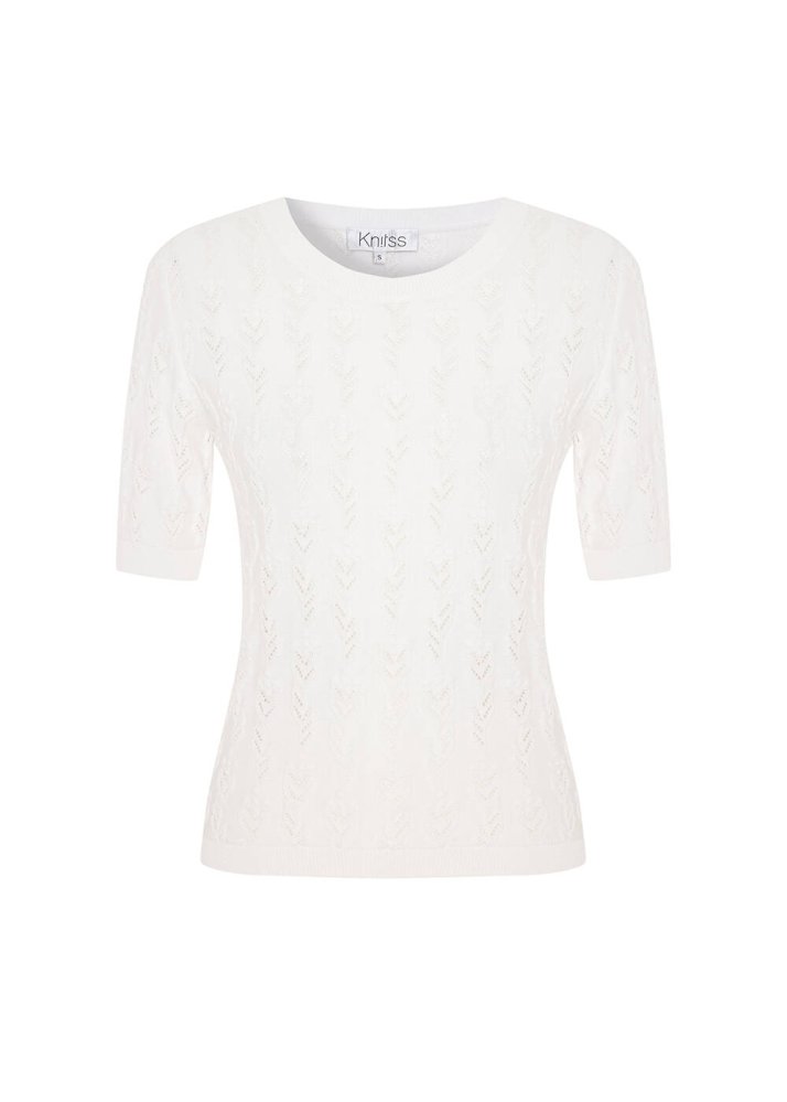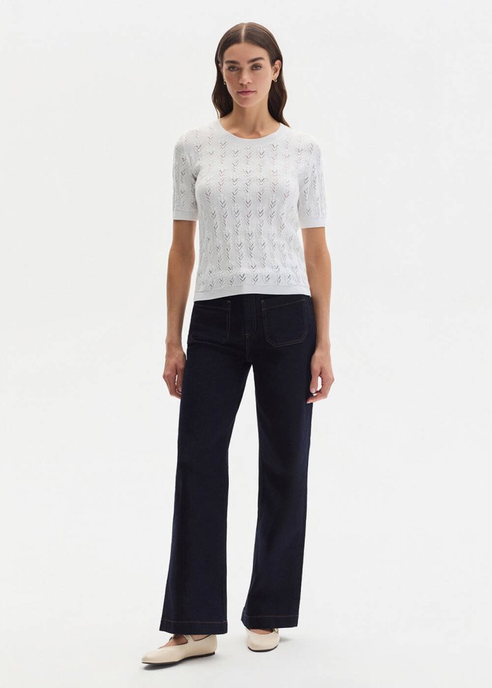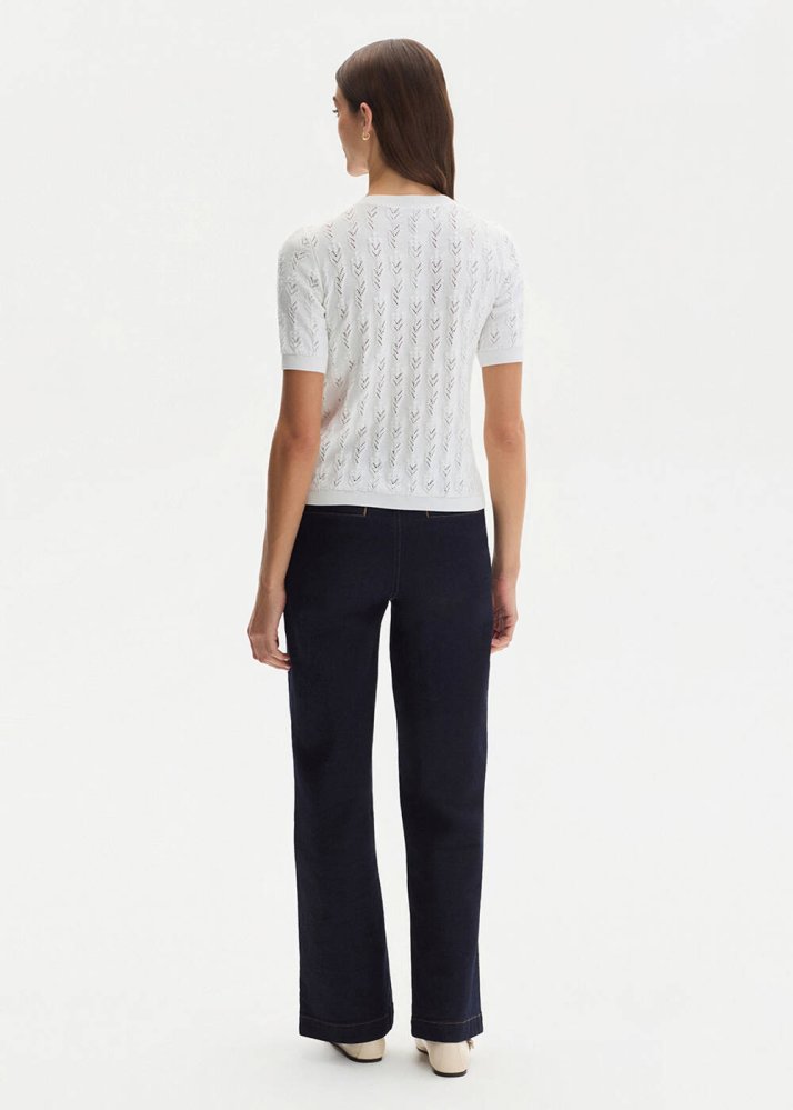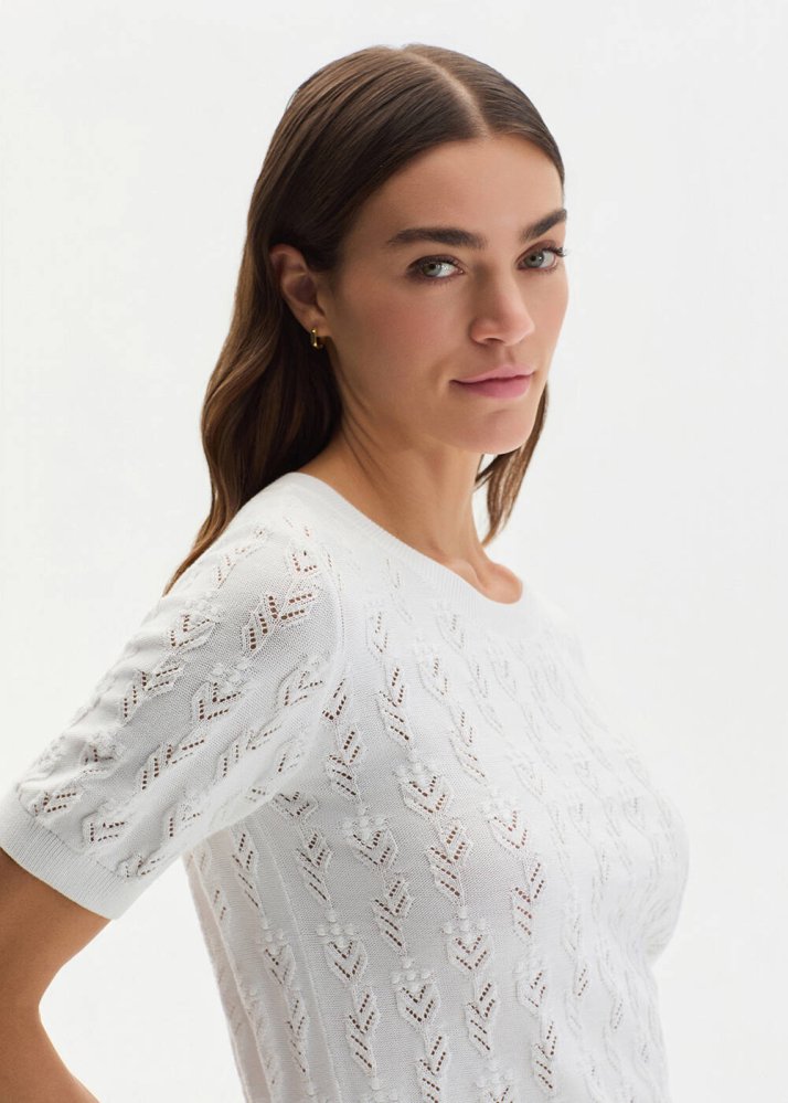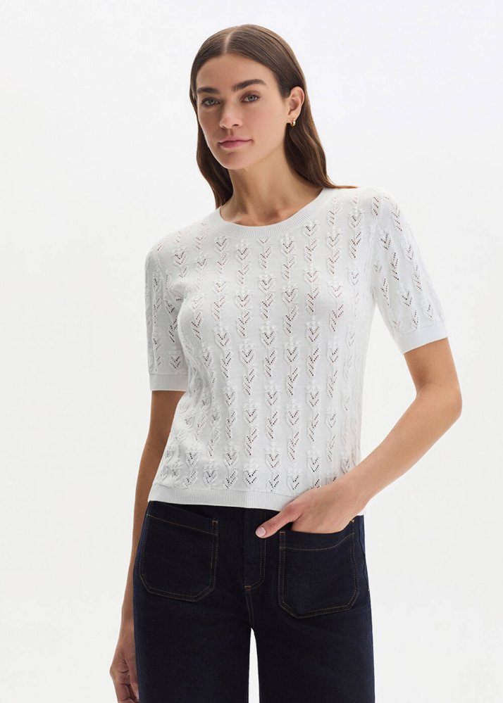 Ajur çiçek desenli dokusuyla hafif ve zarif bir etki sunan triko üst, %100 organik pamuk içeriğiyle nefes alabilen ve ciltle uyumlu bir kullanım sağlar. Kısa kol ve yuvarlak yaka formu sade bir siluet oluştururken, beyaz tonu saf, aydınlık ve zamansız bir görünüm kazandırır. Günlük stilinizde konforu ve rafine minimalizmi bir arada sunan, her kombinle kolayca uyum sağlayan bir parçadır.