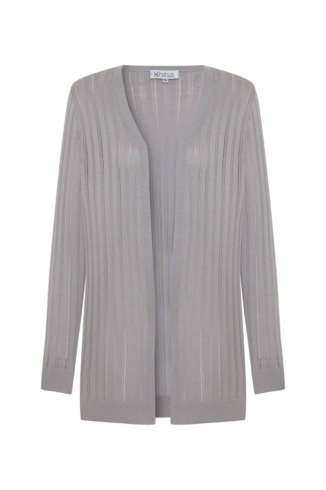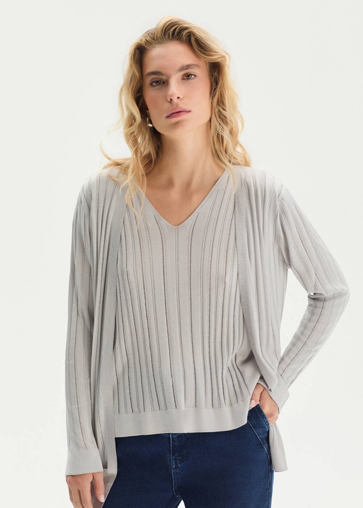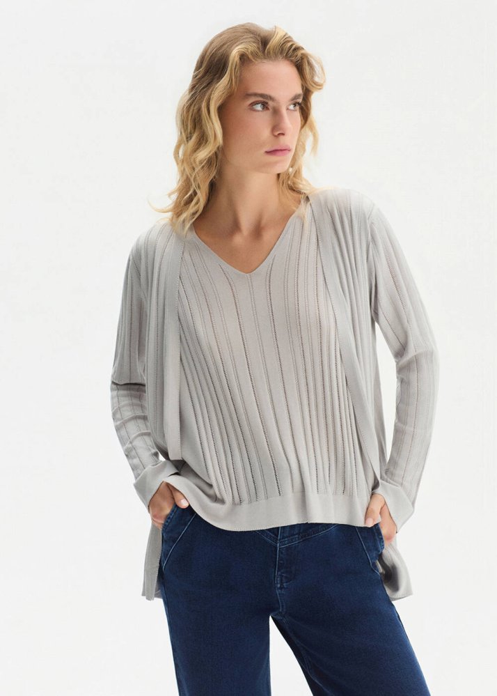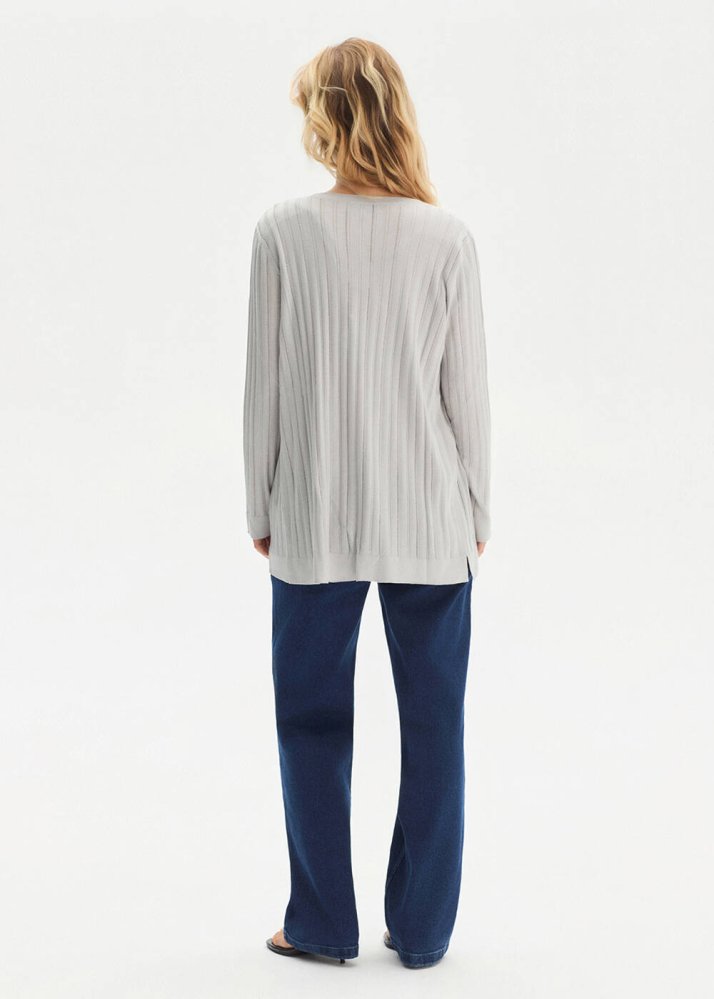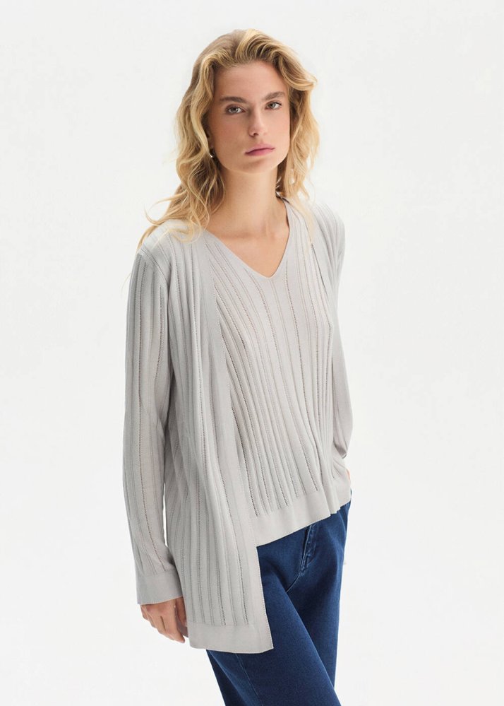 Açık Gri İpek Karışımlı Triko Hırka, yumuşak tonların modern duruşunu ince ajur dokusuyla tamamlar. Rahat kalıbı ve akıcı formu sayesinde gün boyu konfor sağlarken, hafif yapısı katmanlı kullanımlara uyumlanır. Geri dönüştürülmüş ipek ve cupro karışımıyla üretilen bu parça, sürdürülebilir ve rafine bir stil sunar.
