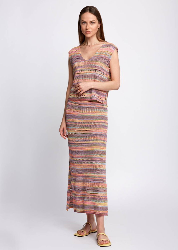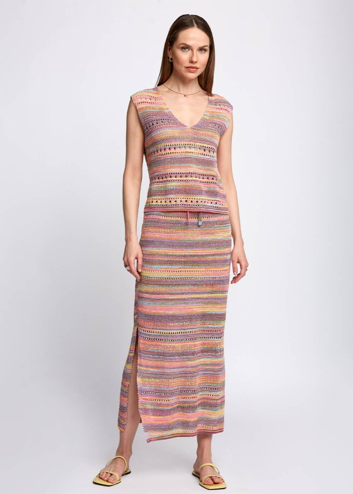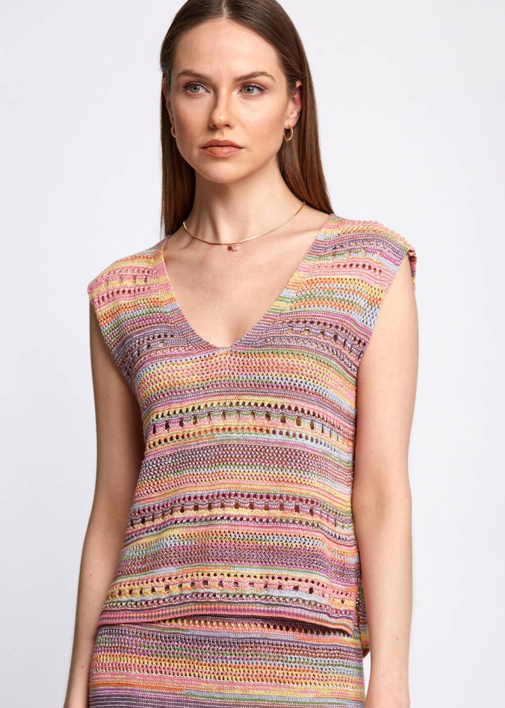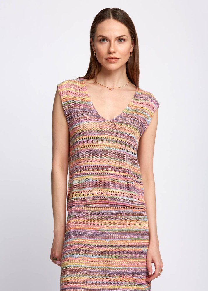 Sıcacık yaz renklerini üzerinizde taşıyacağınız Knitss triko üst modelini şimdi keşfedin. Ajur detaylı triko üst, yumuşak dokusu, rahar kalıbı ve v yaka detayı ile şık ve rahat bir kombin tamamlayıcısıdır. Hafta içi ve hafta sonu stilinize enerji katacak triko üst modelini, takımı olan Sophia Skirt ile kombinleyebilirsiniz.