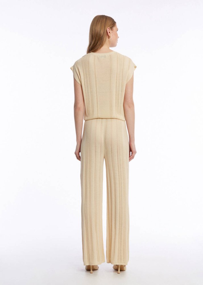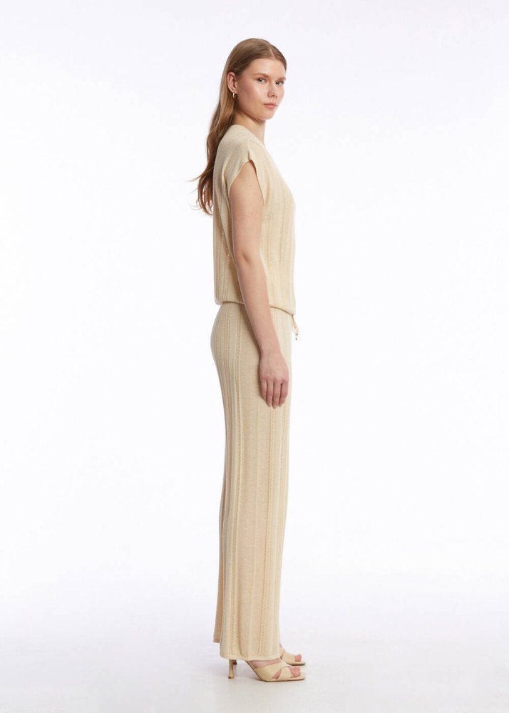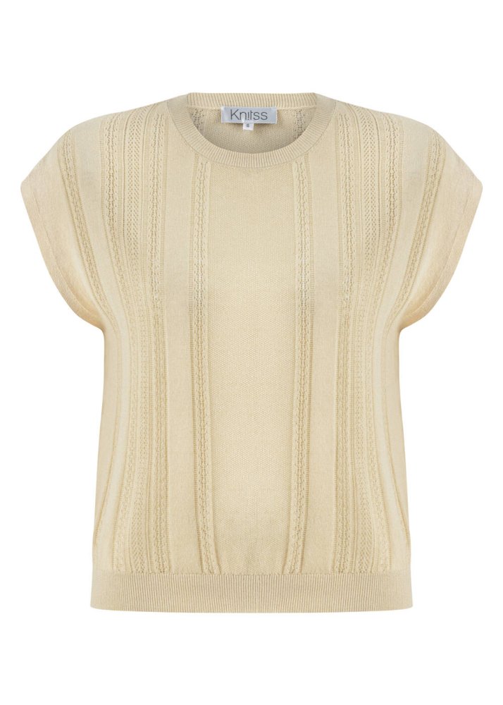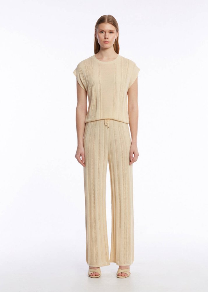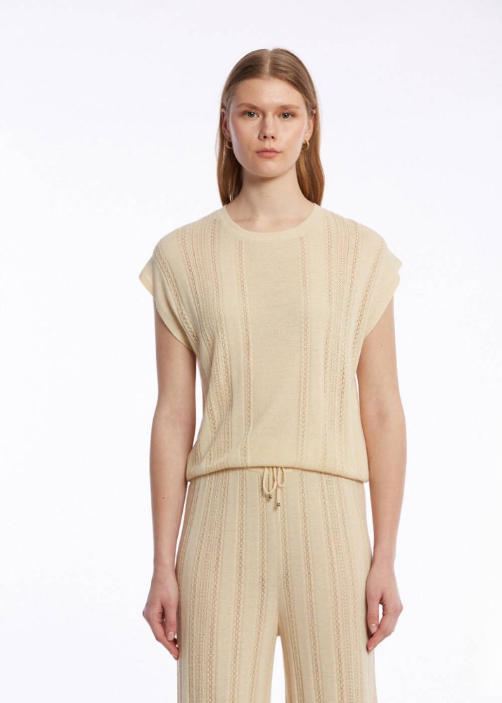 Keten karışımlı geri dönüştürülmüş İtalyan ipliklerinden üretilen düşük omuzlu kısa kollu bej triko üst ile sofistike görünün. Serin tuşesi, hafifliği ve inceliği ile yaz sıcaklarında maksimum konfor sunan bej triko üst, ajur örgü detaylı çağdaş stili ile hem şık hem günlük kombinlere zahmetsizce uyum sağlar.