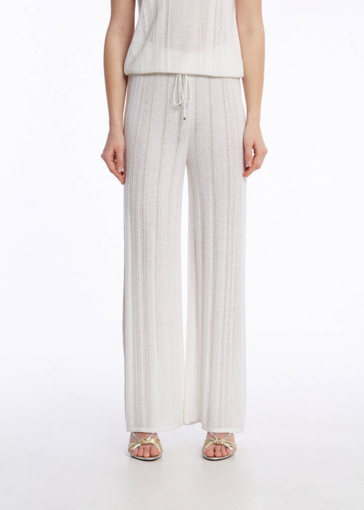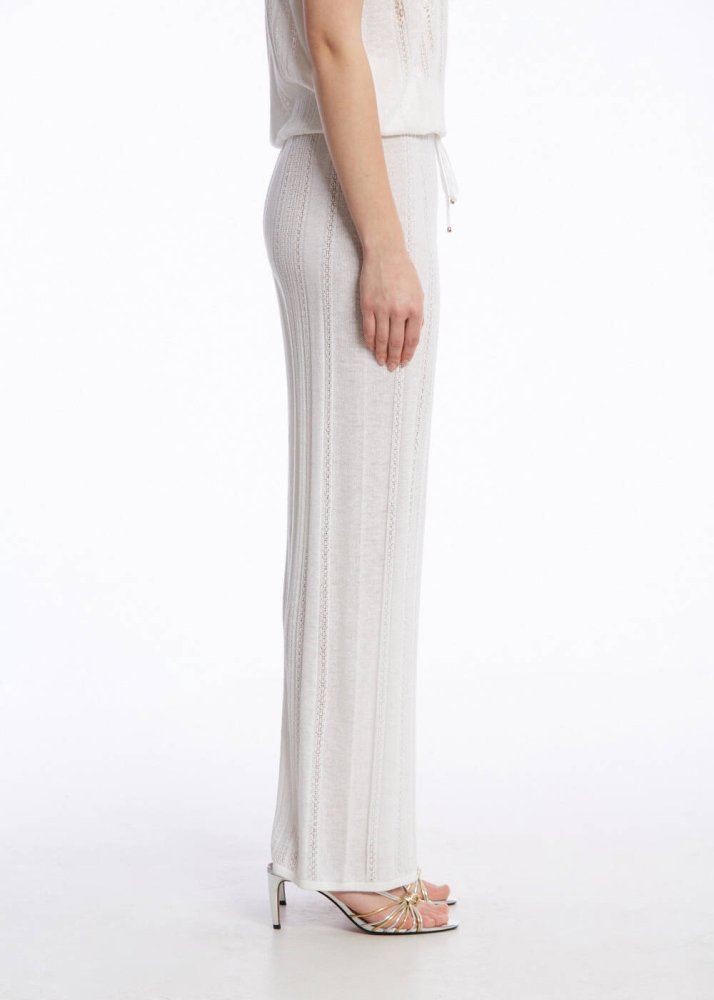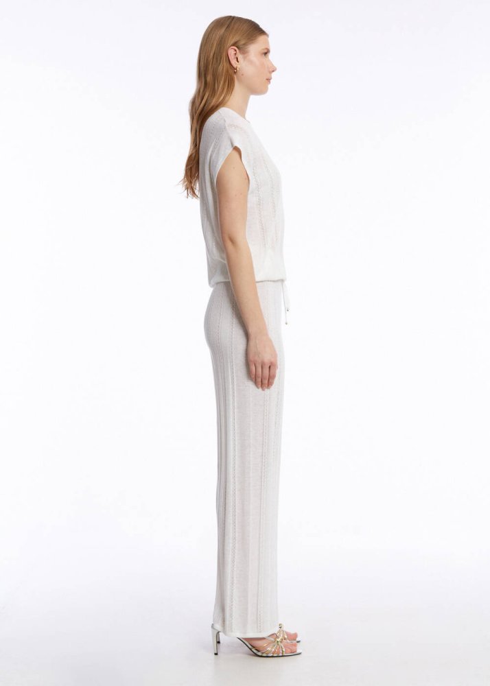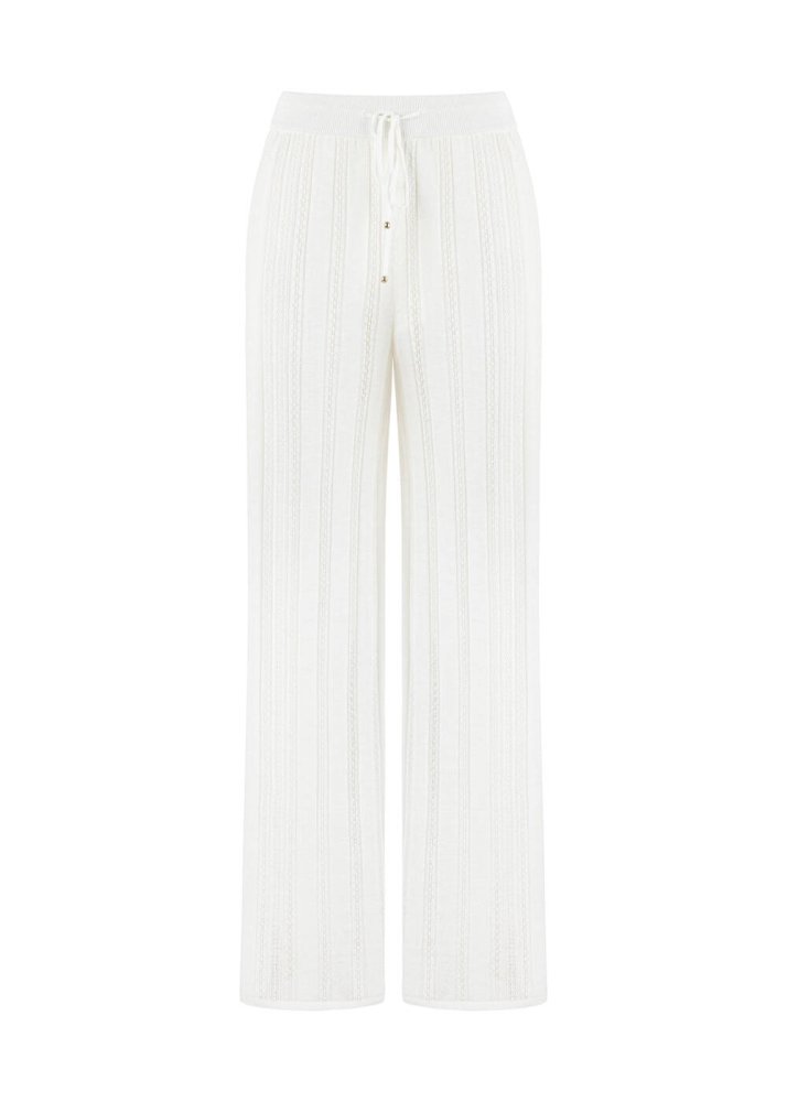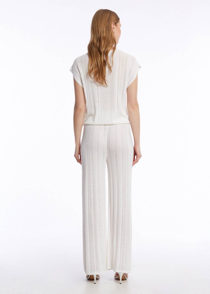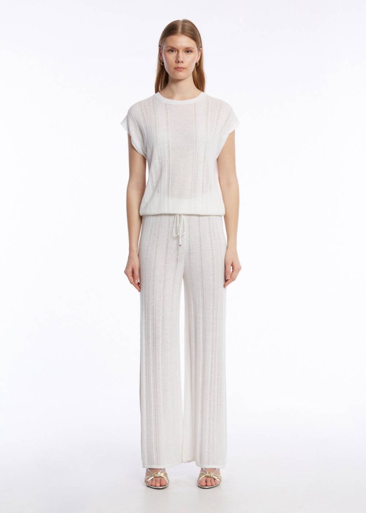 İncecik triko dokusu ve keten karışımlı geri dönüştürülmüş iplik içeriği ile doğayla uyumlu giyimi yazlık kadın kombinlerine taşıyan beyaz pantolonu keşfedin. Ajur örgü detayları, özgün stili, kusursuz kalıbı ve rahatlığı ön planda tutan şıklığı ile ayrıcalıklı, sofistike ve rahat bir parçadır.