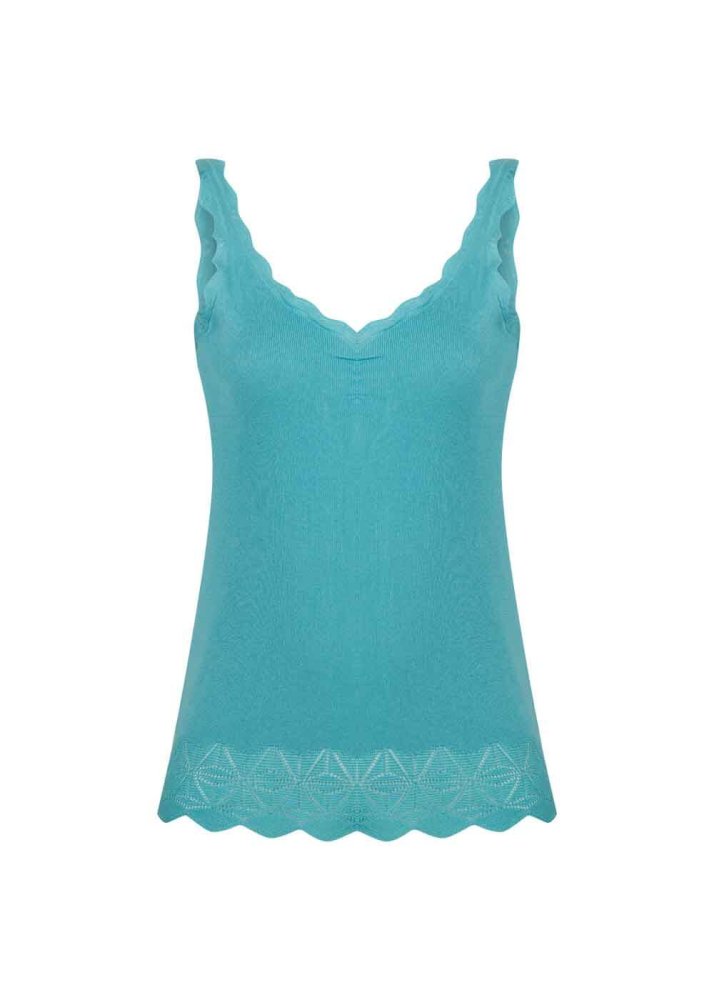 İncecik triko kumaşı ile efil efil bir yazlık stil sunan mavi askılı triko üst, etek ucundaki ajur örgü detayı ve geri dönüştürülmüş İtalyan iplik kalitesi ile hayranlık uyandırır. Günün her anı rahatlığından ödün vermeden şık olmayı bilen özgür ruhlu Knitss kadınları için üretilen mavi triko üst, takımı olan pantolonla özgün bir yazlık giyim deneyimi sunar.