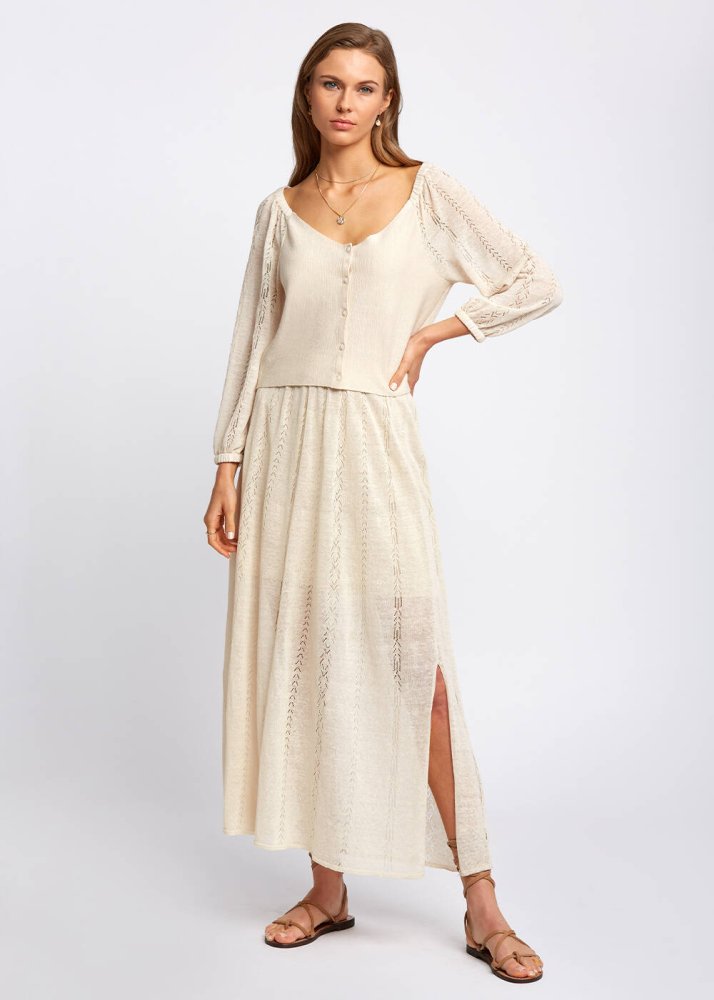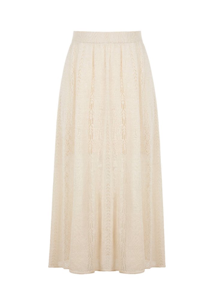 Ajur Örgü Detaylı Yırtmaçlı Bej Uzun Triko Etek