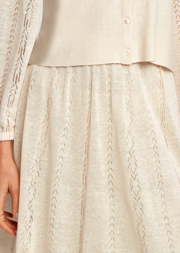 Ajur örgü detaylı triko etek, yumuşacık dokusu ve rahat kalıbı ile konforlu bir giyim deneyimi sunarken, iki yandan yırtmaç detayı ile de Knitss şıklığını kombinlerinizle taşır. Triko etek modeli, sürdürülebilir yöntemlerle birinci sınıf İtalyan ipliklerinden üretilmiştir. Business ve günlük stilinize kolaylıkla uyum sağlayacak uzun bej triko etek, takımı olan Naomi Top ile mükemmel bir kombin tamamlayıcısıdır.