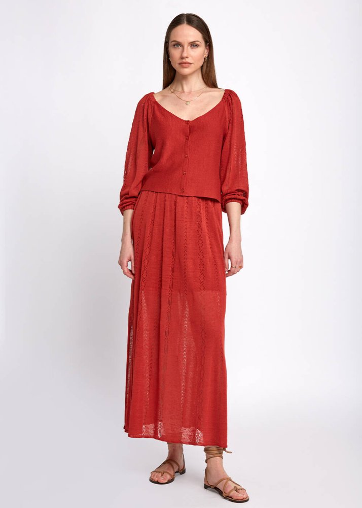 Ajur Örgü Detaylı Yırtmaçlı Tarçın Rengi Triko Etek