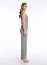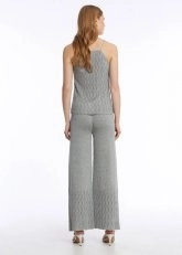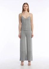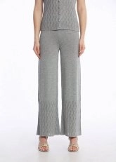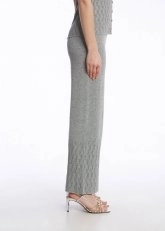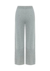 Ajur örgü detaylı gri triko pantolon, hem ofis hem de günlük kombinler için kullanışlı bir parçadır. Geri dönüştürülmüş İtalyan ipliklerinden üretilen gri triko pantolon, hafif ve ince dokusu, elastik beli, rahat kalıbı ve kusursuz kalıbı ile yazlık giyim dolabınızın en kullanışlı parçalarından olmaya adaydır. Takımı olan askılı triko üstle veya Knitss koleksiyonundan birçok parça ile kombinlenebilir.