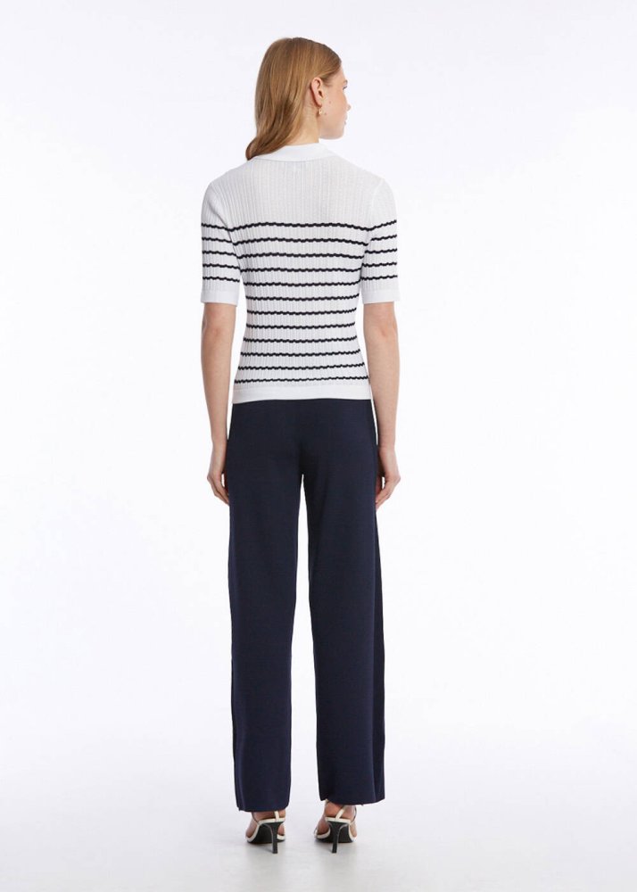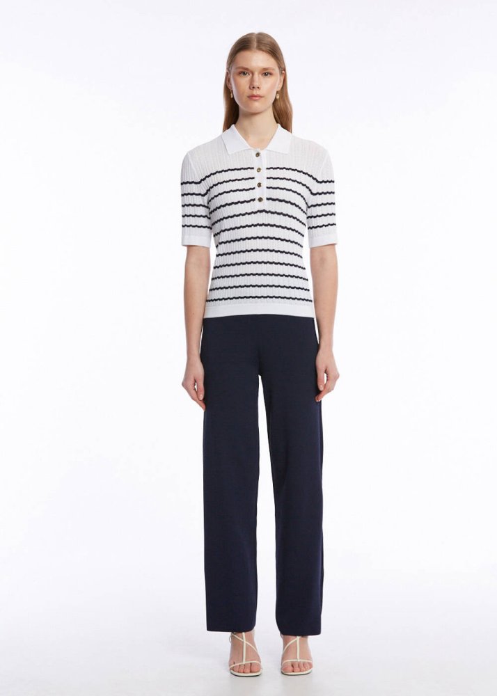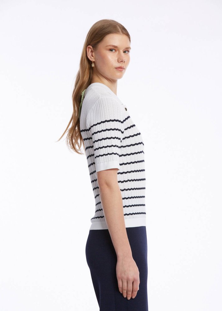 Yazlık giyim dolabınızın lokomotif parçalarından olacak lacivert çizgili kısa kollu polo yaka beyaz üst, ajur örgülü dokusu, Knitss’e özgü zarif detayları ve zamansız şıklığı ile çok kullanışlıdır. İtalyan ipliklerinden üretilen polo yaka çizgili beyaz triko üst, altın düğmeli ajur desenli triko stili ile hem günlük hem de ofis kombinleri için idealdir.