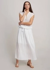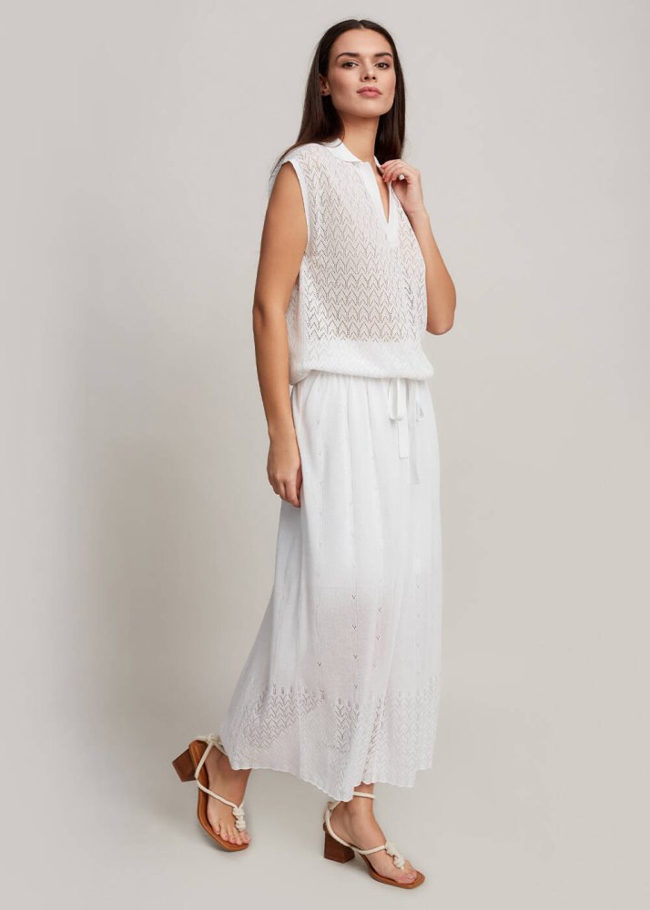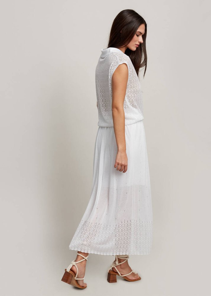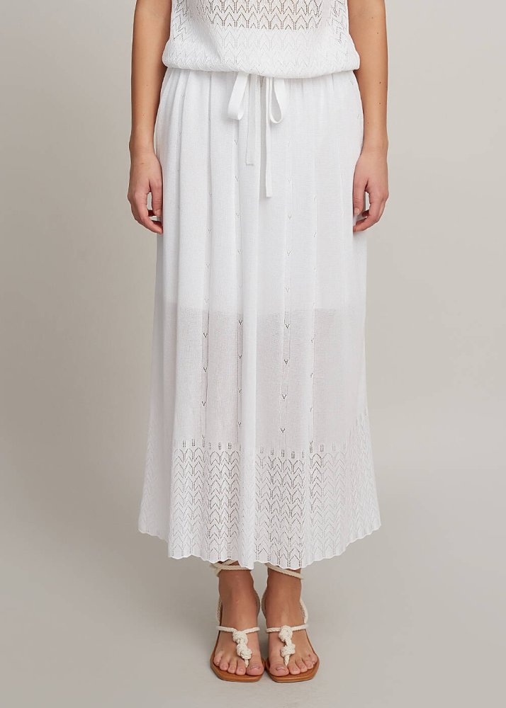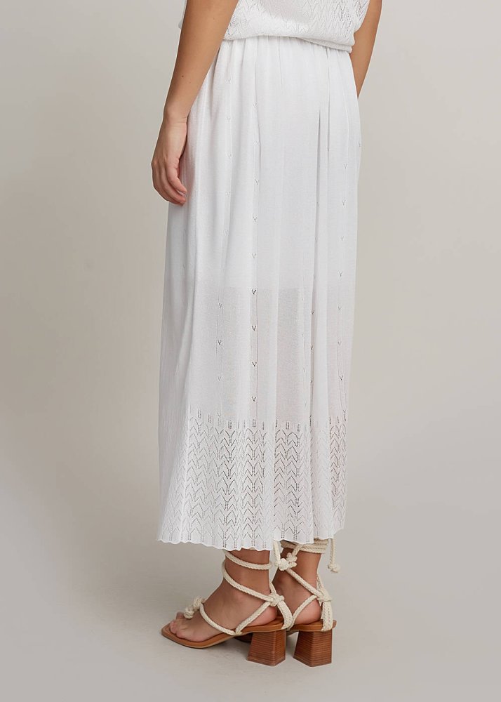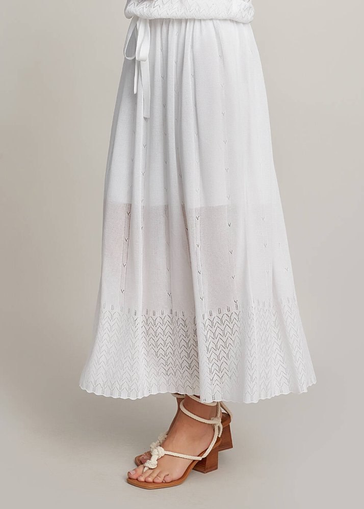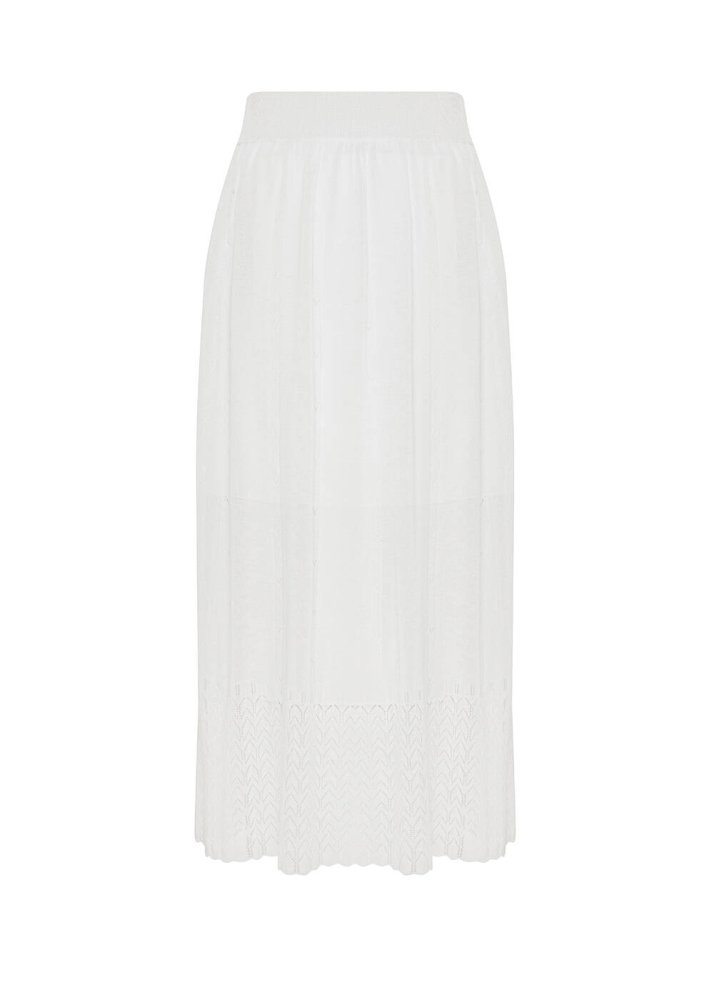 Belden lastikli beyaz midi etek, triko zarafetini Knitss’e özel detaylarla yazlık dolabınıza davet eder. Çok şık ajur örgü deseni ve incecik yüzeyi ile romantik bir auraya sahip beyaz etek, İtalyan viskon iplik kalitesi ile ayrıcalıklıdır. Bu iplikler, dünyada ormanların korunması ilkelerine bağlı FSC sertifikalıdır. Hem günlük hem klasik kombinleriniz için zamansız bir üründür.