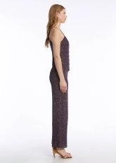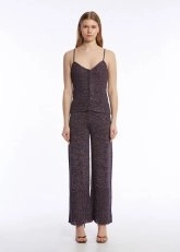 Geri dönüştürülmüş İtalyan ipliklerinden sürdürülebilir moda ilkelerine göre üretilen mor triko pantolon, rahat ve şık yazlık kadın kombinleri için stil sahibi bir parçadır. Hafif ve ince dokusunu elastik bel ve rahat kalıpla tamamlayan mor triko pantolon, konforu ön planda tutan şıklık sunar. Zarif ajur örgü detayı ve mükemmel kalıbı ile kusursuz bir görünüm vadeder.