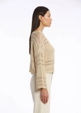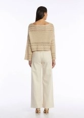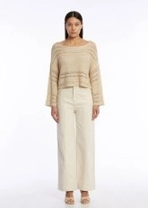 Zamansız şıklığı zarif ajur örgü detayıyla bir arada sunan bej rengi kayık yaka oversize triko üst, gündüzden geceye kullanıma uygundur. Geri dönüştürülmüş pamuk ve viskon içeriği ile doğaya saygılı giyimi benimseyen Knitss ilkelerine göre üretilen triko üst, ajur örgü deseni ile çok şıktır. İster topuklularla ister spor ayakkabılı günlük yazlık kıyafetlerle kolayca eşleşir.