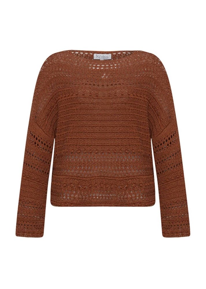 Salaş bohem tarzıyla yazlık kadın kombinlerine çok yakışacak tütün rengi oversize triko üst, ajur örgünün en güzel işçiliklerinden biridir. Geri dönüştürülmüş pamuk ve viskon ipliklerinden üretilen uzun kollu oversize triko üst, sürdürülebilir giyim anlayışının şık ve konforlu bir temsilcisidir. Rahatına düşkün, doğaya duyarlı ve özgür Knitss kadınlarının favori parçalarından olmaya adaydır.