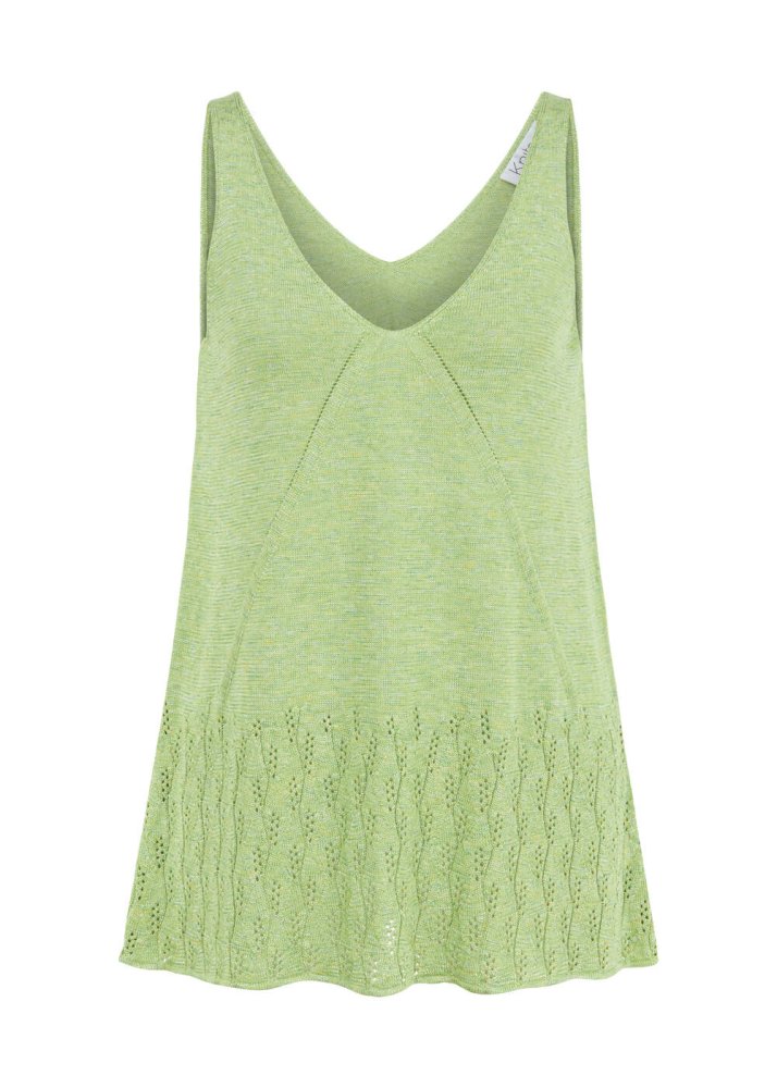 Rahat, şık ve stil sahibi yazlık kadın kombinleri için üretilen yeşil v yaka kolsuz triko üstü keşfedin. Geri dönüştürülmüş İtalyan ipliklerinden üretilen yazlık triko, hafifliği ve uçuculuğu ile yaz sıcaklarında maksimum konfor sunar. Ajur örgü detayları, çağdaş stili, derin v yaka modeli ile günlük ve şık kombinlere zahmetsizce uyum sağlar.