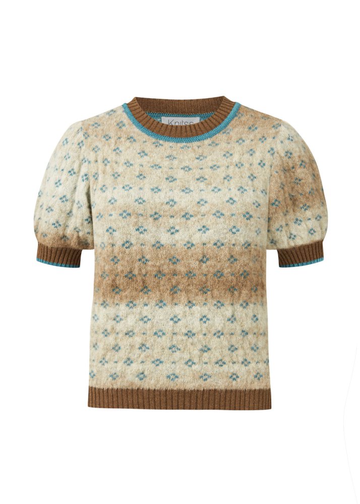 Alpaka yün karışımlı kabarık kısa kollu triko üst ile kışlık kombinlerinize Knitss ayrıcalığını taşıyın. Yumuşak Alpaka yününün tensel duyuları harekete geçiren dokusu ve sıcacık tutan yapısı sayesinde gün boyu konfor sunan kabarık kollu triko üst, camel ve mavinin kusursuz uyumu ve degrade geçişli zarif deseni ile çok şıktır.