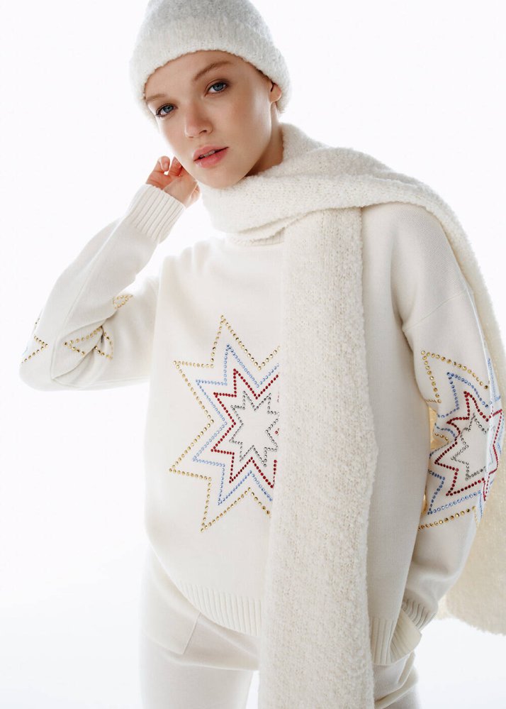 Renkli Yıldız Desenli Merino Yün Triko Ekru