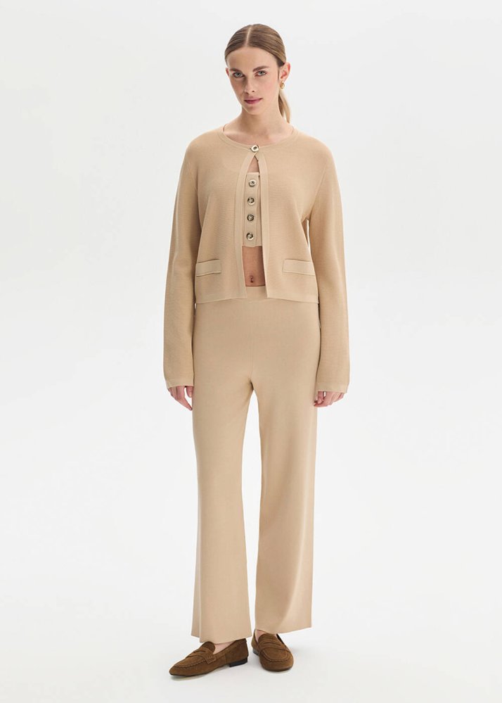 Apolet Detaylı Bej Triko Pantolon