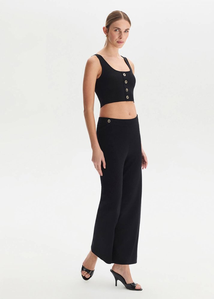 Allen Pants siyah triko pantolon, düz kesimi ve dengeli paça formuyla zamansız bir siluet sunar. İtalyan ipliğiyle örülen FSC viskon karışımlı dokusu hafif ve nefes alabilen bir yapı sağlar. Elastik bel tasarımı gün boyu konfor sunarken fileto cep ve apolet detayları tasarıma modern bir karakter kazandırır. Minimal kombinler için güçlü bir tamamlayıcıdır.