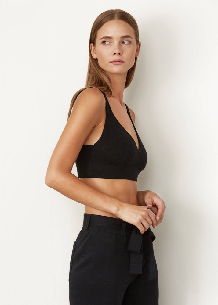Her kadının dolabında olması gereken kullanışlı ve çok şık bir kombin tamamlayıcısı olan siyah crop triko üst, sürdürülebilir yöntemler ile saf İtalyan Merino yününden üretilmiştir. Gündüzden geceye zahmetsiz şıklık sunan askılı crop triko üst, slim fit kalıba ve yumuşak dokuya sahiptir. Koleksiyonun Mix&Match özelliği ile diğer parçalar ile kolaylıkla kombinlenebilir.