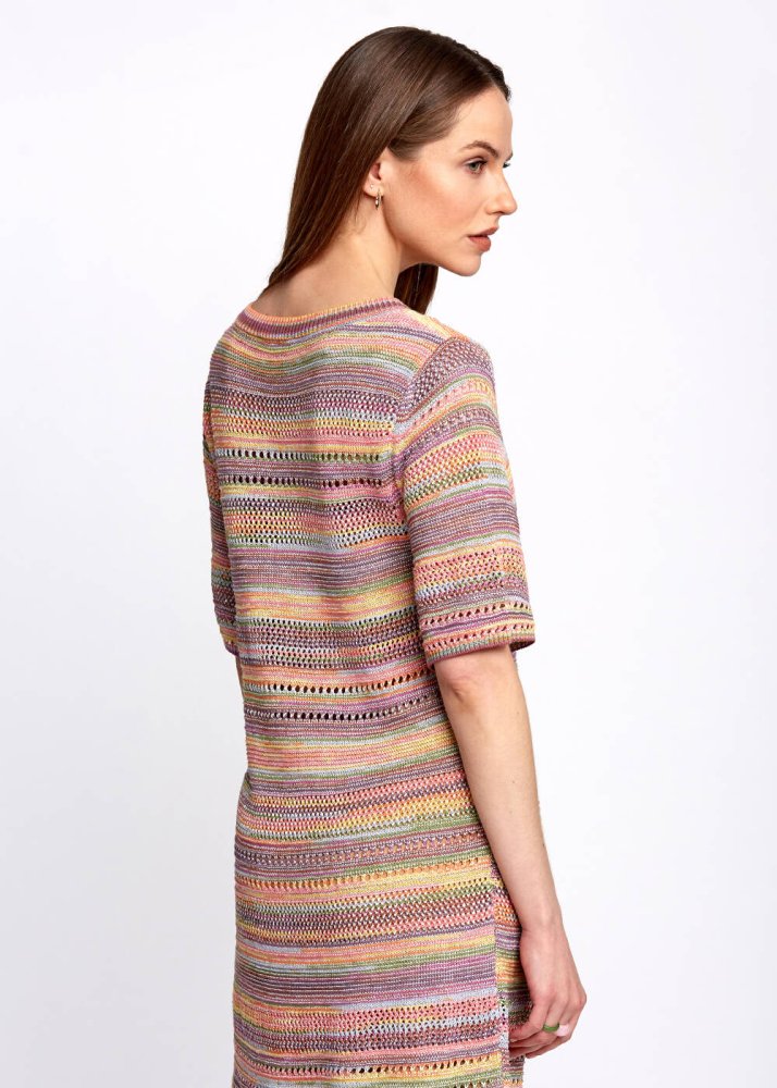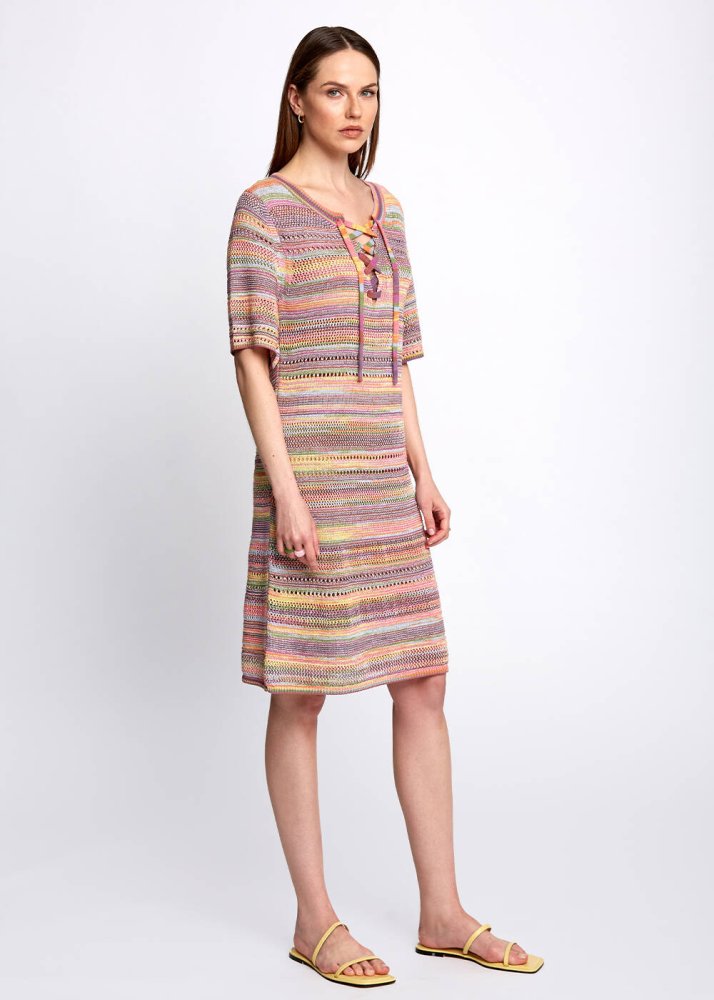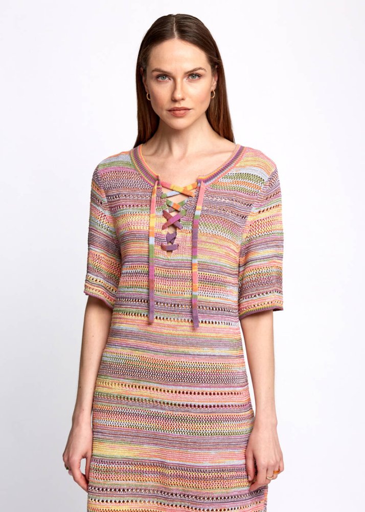 Yarım kol triko elbise, Knitss’in renk ve desen oyunlarına sahiptir. Bağcık detaylı triko elbise, çıkarılabilir askı detayı ve yumuşak dokusu ile konforlu bir kullanım deneyimi sunar. Yaz günlerinde giy-çık parçalardan olacak tarçın rengi triko elbise modeli, hafta sonu sportif stilleriniz için idealdir.