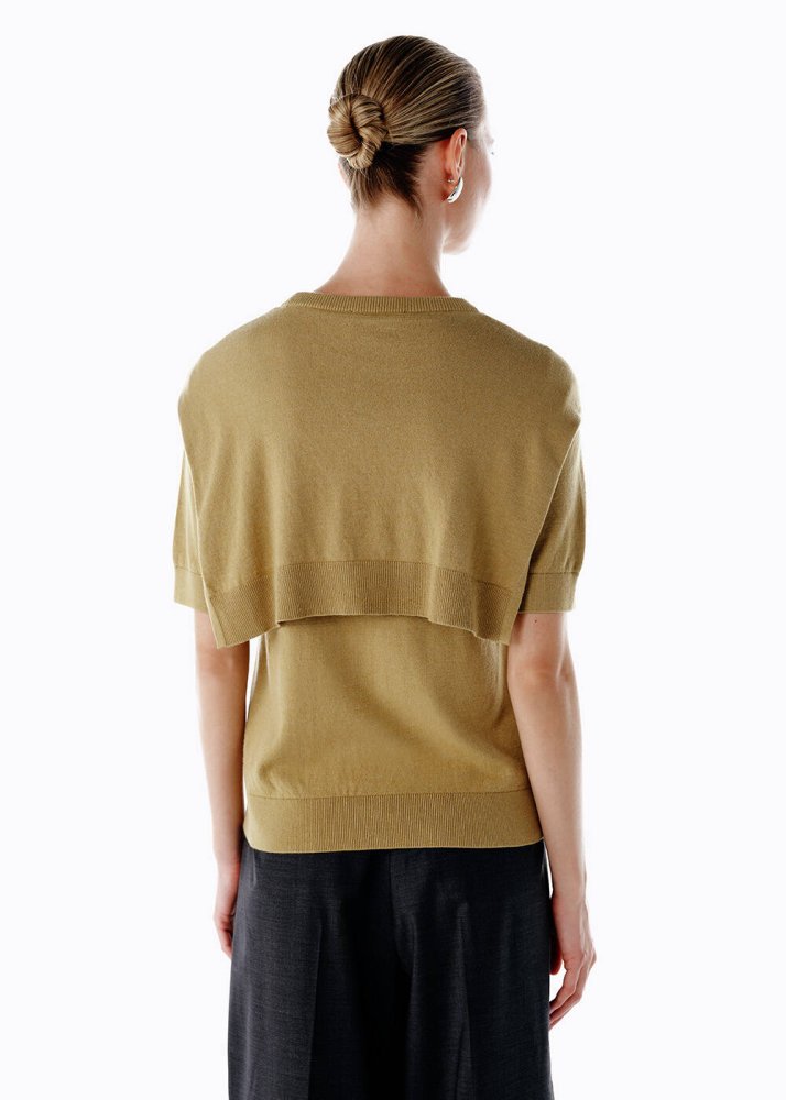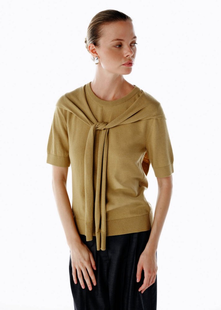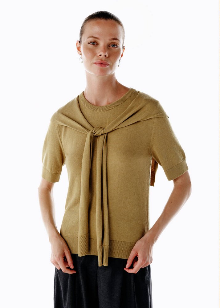 Doğal tonların zarafetini taşıyan bu olive triko üst, çabasız ama özenli bir stilin anahtar parçası. Zarif bağlama detayıyla şehirli kadınların rahat şıklığını yeniden tanımlıyor. Yumuşak İtalyan ipliğiyle üretilen dokusu, günün her anında konforu ve zarafeti bir arada sunuyor. Kısa kollu formu ve akıcı düşüşüyle hem ofis günlerinde hem hafta sonu buluşmalarında kolayca stilinize uyum sağlar.