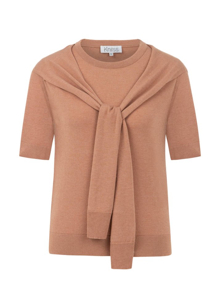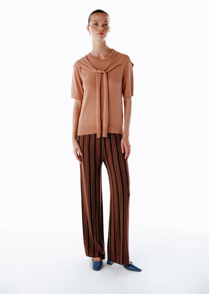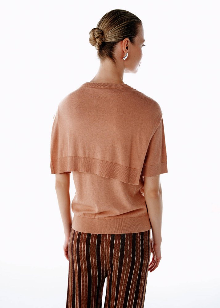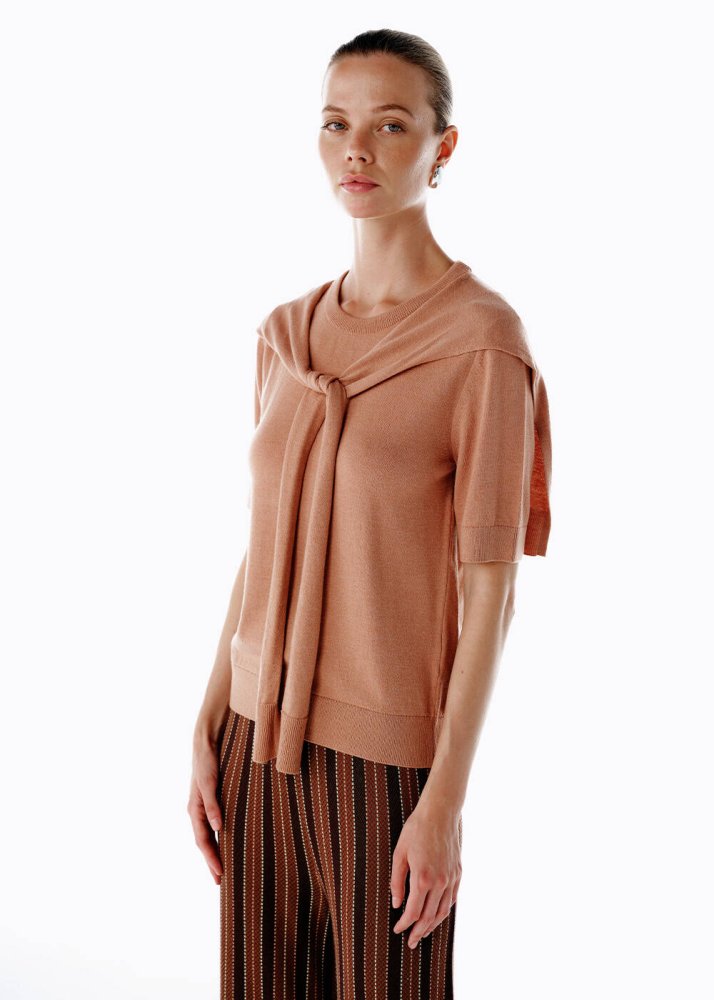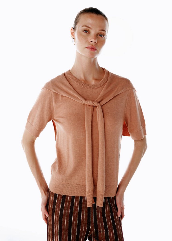 Yumuşacık dokusu ve zarif pembe tonu ile bu triko üst, günün her anına taze bir enerji katıyor. Bağlama detayı, sade formuna feminen bir dokunuş eklerken kısa kollu tasarımıyla modern bir duruş sunuyor. %50 FSC viskon, %30 poliamid ve %20 yün karışımıyla nefes alan, konforlu bir yapıya sahip. Triko pantolonlarla ya da triko eteklerle kombinlenebilir. Günün her anında özgüvenli bir stilin anahtar parçası.