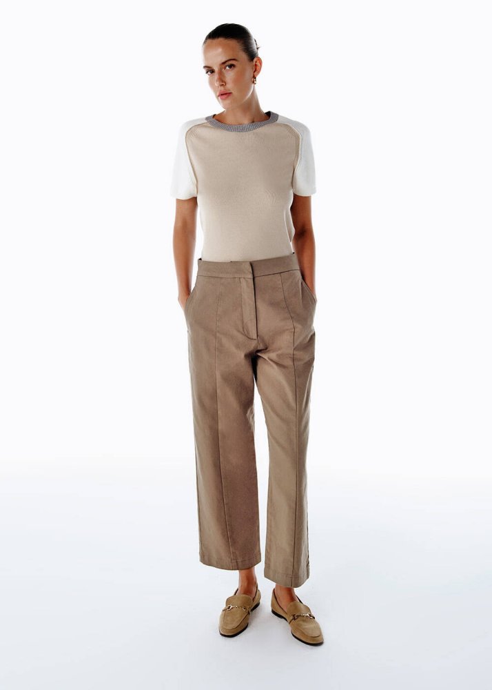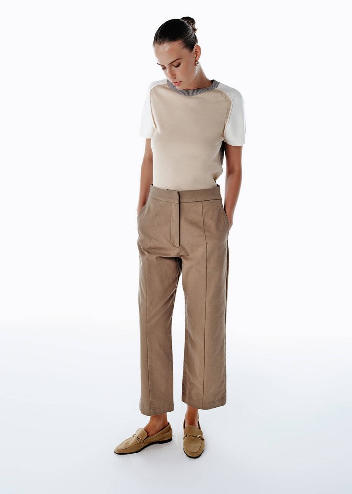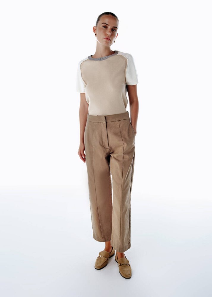 Doğal tonların huzurunu yansıtan camel barrel leg pantolon, rahat kesimiyle şehir yaşamına konforlu bir şıklık getiriyor. Yüksek pamuk oranlı dokusu yumuşak bir his bırakırken, crop boyu ve dikiş detayları modern bir görünüm kazandırır. Knitss kadınının sade ama etkileyici tarzını yansıtan bu parça, hem gündüz ofis kombinlerine hem hafta sonu casual stillere kolayca uyum sağlar.