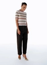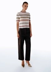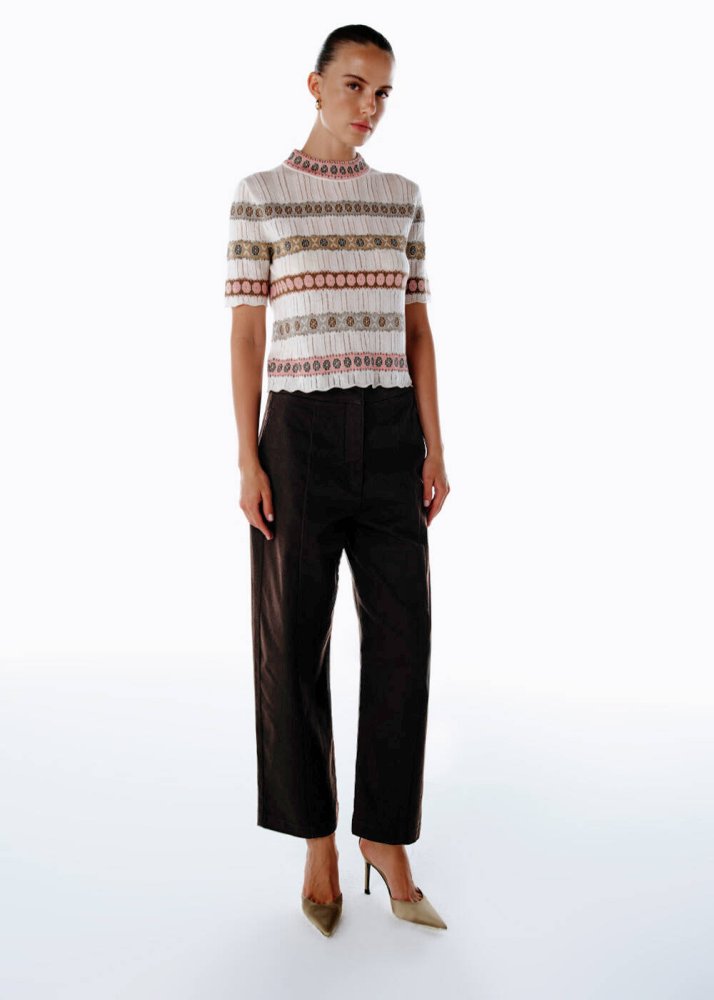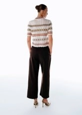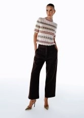 Koyu kahverenginin zarif enerjisini yansıtan bu barrel leg pantolon, gün boyu konfor ve modern bir duruş sunar. Pamuk ve elastan karışımı dokusuyla formunu korurken, hareket özgürlüğü sağlar. Dikiş detayları tasarıma karakter katar, crop boyu ise şehirli bir dinamizm yaratır. Cepleriyle işlevselliği destekleyen bu parça, ister triko bir üstle ister gömlekle mükemmel tamamlayıcıdır.
