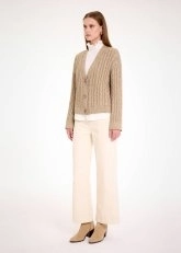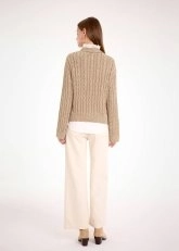 Bej saç örgü hırka, simli yapısı ve geri dönüştürülmüş pamuk karışımlı İtalyan ipliklerinden üretilen sürdürülebilir trikosu ile Knitss farkını kadın kombinlerine taşır. Işıltılı bej hırka; günlük ve iş kombinleri ile kolaylıkla eşleşen şık feminen tarzının yanında, rahat kalıbı ile de konforu ön planda tutan bir giyim deneyimi yaşatır.