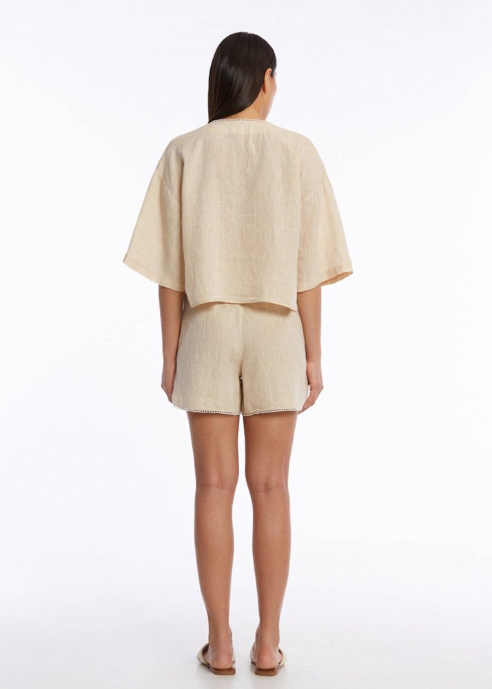 Gardırobunuzun vazgeçilmezi olacak kontrast detaylı bej keten üst, zamansız şıklığı deniz kabuğu düğmesinin benzersizliğiyle birleştiriyor. Her kombininize sofistike bir hava katacak bu özel detay, sıradanlıktan çıkarıyor.Beyaz ajur geçişleriyle modern bir dokunuş katarken, rahat kesimi sayesinde gün boyu konfor sunuyor.