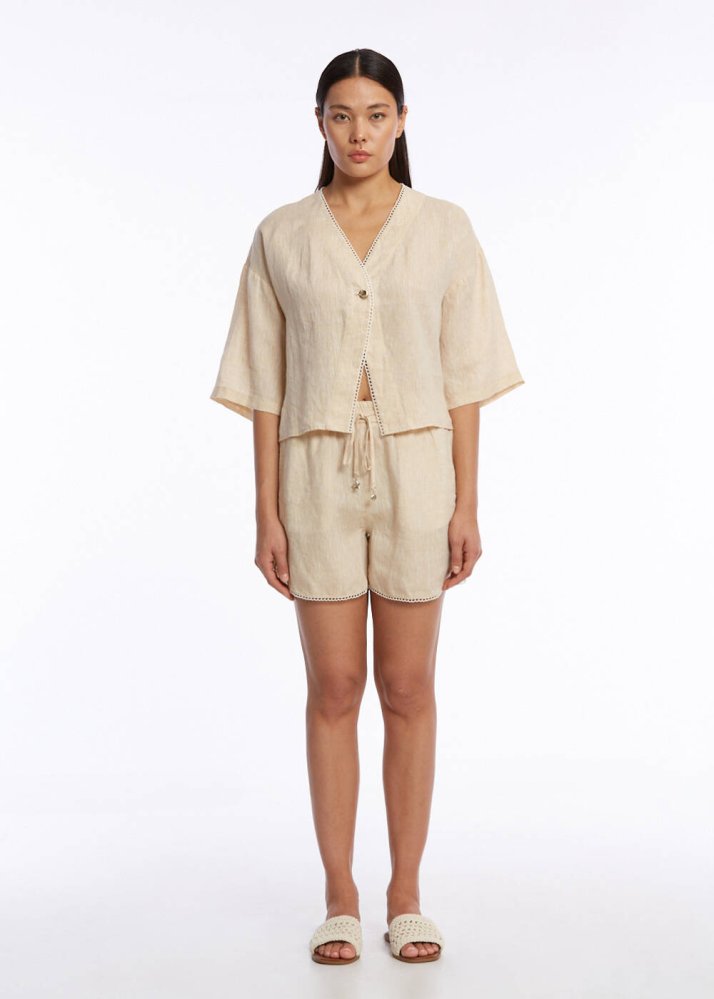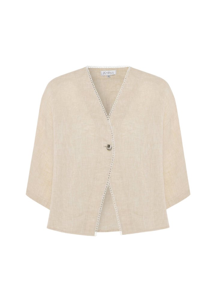Bej Kontrast Detaylı Keten Üst