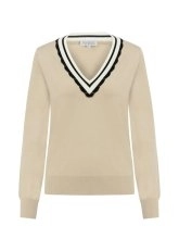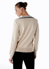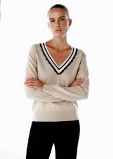 İlk bakışta göze çarpan estetik detaylarıyla öne çıkan bu bej v yaka triko, zarif duruşuyla Knitss kadınlarının gardırobunda öne çıkan parçalar arasında yer alıyor. Kontrast şeritler, trikonun minimal tasarımına sofistike bir hareket katarken yumuşak ve hafif dokusu gün boyu rahatlık sağlıyor. Hem iş günlerinde hem de sosyal anlarda fark yaratan bu parça, Knitss’in çağdaş ve feminen stil anlayışını yansıtır nitelikte.