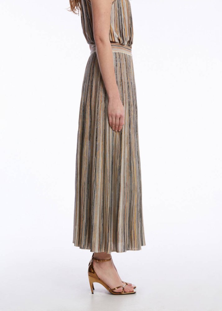 Özgün zevklerini stil sahibi parçalarla kombinlerine taşımayı seven kadınlar için üretilen renk bloklu çizgili triko eteği keşfedin. Geri dönüştürülmüş sertifikalı İtalyan ipliklerinden üretilen çizgili, kendinden pileli maxi triko etek, doğanın dingin renklerini Knitss’in çağdaş stili ile bir araya getirir. Elastik beli, hafifliği ve hacimli duruşu ile konforu önceleyen bir şıklık sunar.