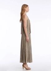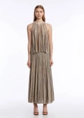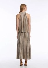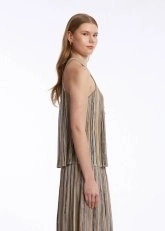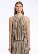 Feminen zarafeti ve sofistike stili ile hayranlık uyandıran kolsuz düğmeli yakalı triko üstü keşfedin. Bej ve kahverengi renk bloklu çizgili özel deseni, dökümlü kalıbı, zarif mücevher düğmeli yakası ve çağdaş triko stili ile yazlık kadın kombinlerine ayrıcalık katar. Sertifikalı geri dönüştürülmüş İtalyan ipliklerinden üretilen kolsuz triko üst, sürdürülebilir modanın şık bir temsilcisidir.