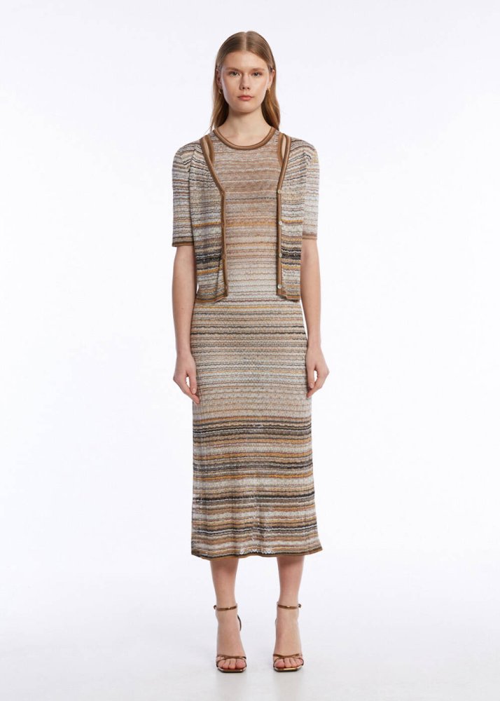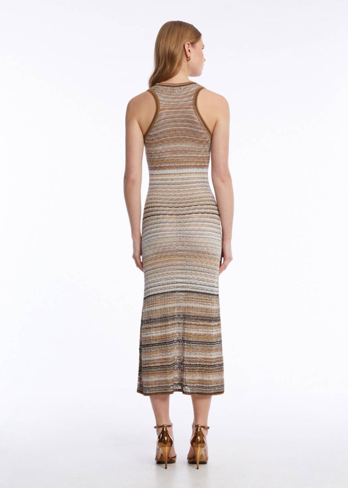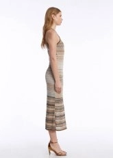 Kusursuz kalıbı, ahenk içindeki bej-kahverengi renk geçişli deseni ve rahatlığı şıklıkla buluşturan sofistike stili ile hayranlık uyandıran triko elbiseyi keşfedin. Geri dönüştürülmüş İtalyan ipliklerinden üretilen, spor-şık kombinlere kolayca uyum sağlayan bej renk geçişli çizgili kolsuz triko elbise, konforundan ödün vermeden feminen ruhunu stiline yansıtmayı seven Knitss kadınları için üretildi.