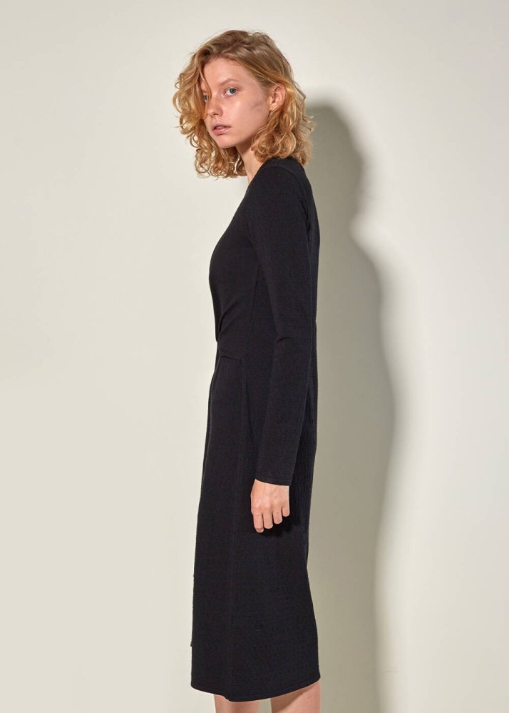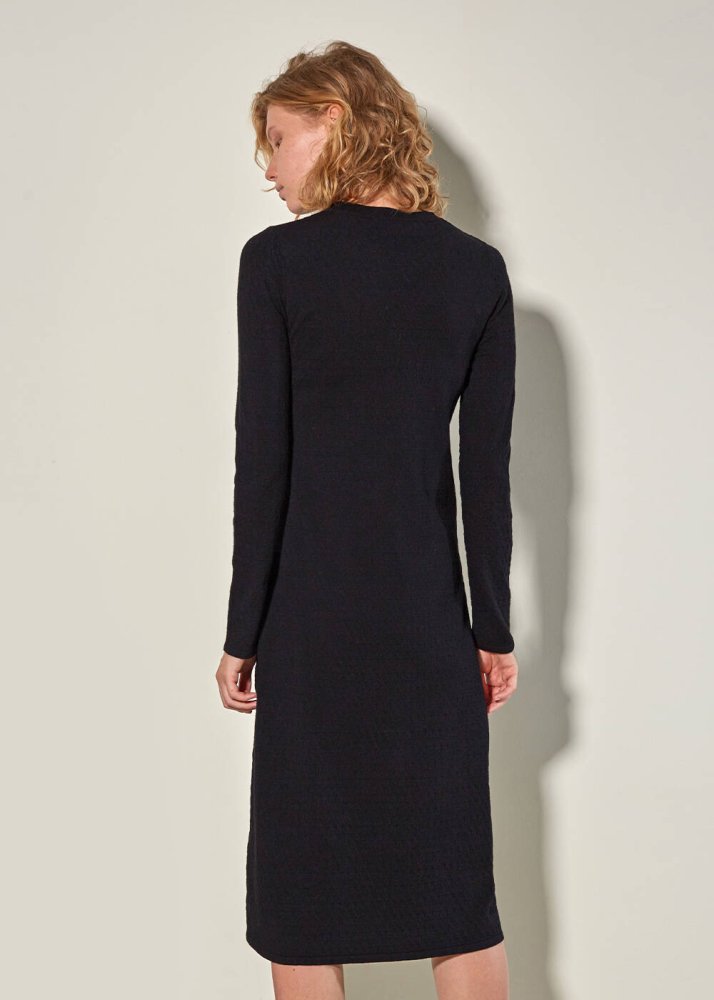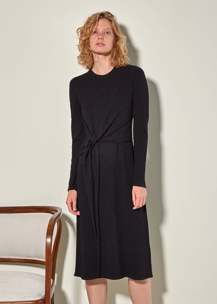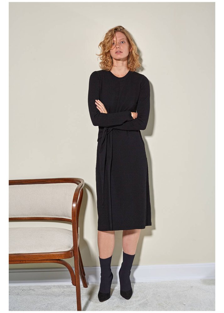 Klasik şıklığı yenilikçi Knitss farkı ile yakalayın. Uzun kollu siyah triko elbise, belden bağlamalı kemeri ve çağdaş feminen tarzı ile minimal şıklığı dolabınıza davet eder. Özel tasarım triko elbise, bisiklet yaka ve midi boy modeli ile zamansızdır. İtalyan iplik kalitesi ile konforlu ve uzun ömürlü giyim deneyimi sunan uzun siyah triko elbiseyle kusursuz görünün.