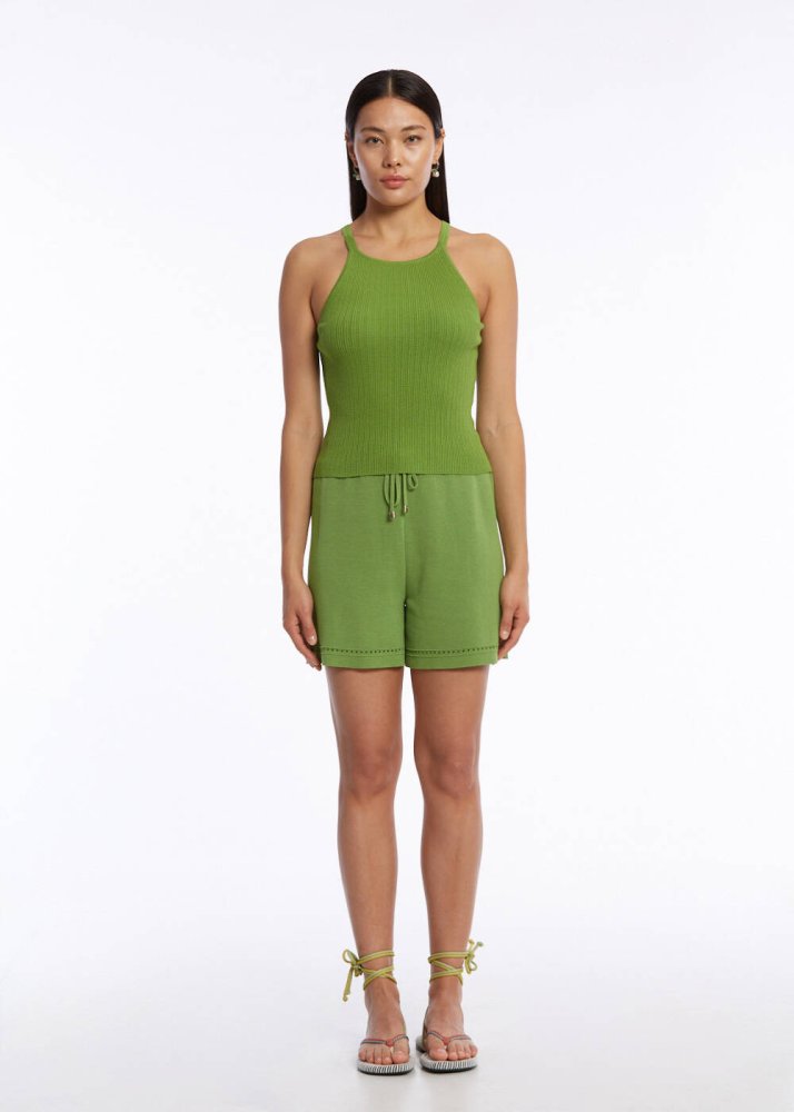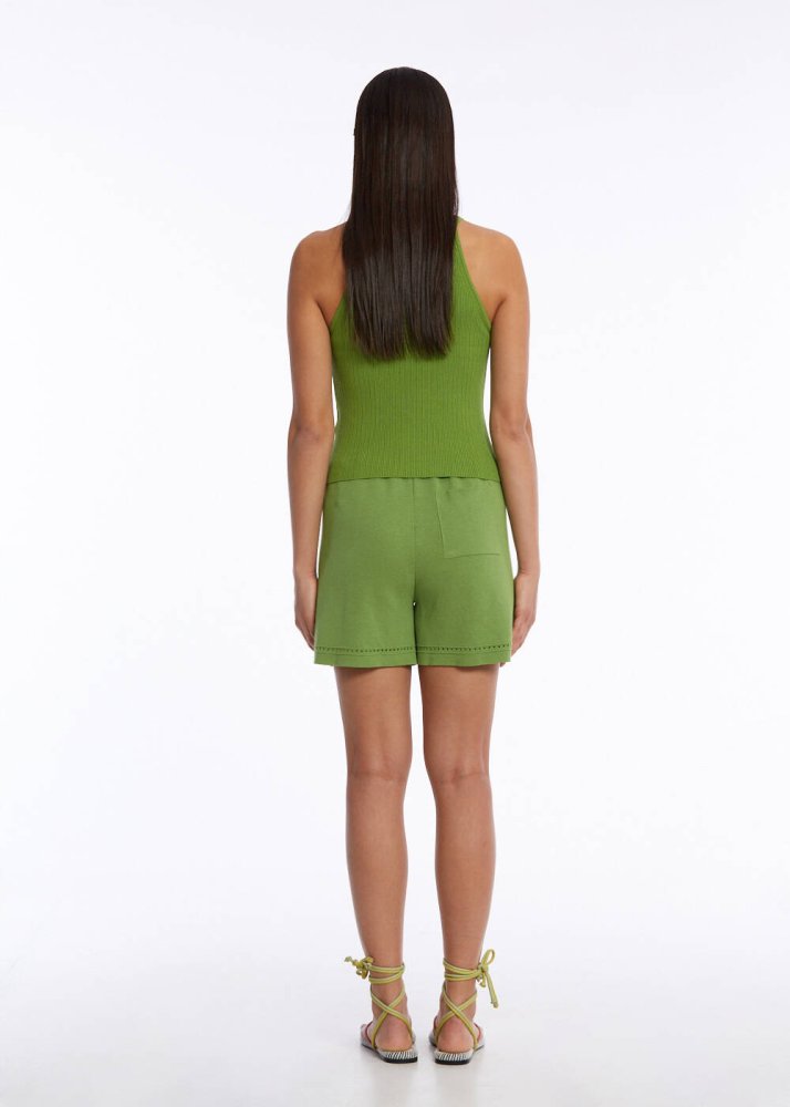 Çok şık, çok rahat, çok özgün... Etek uçları pointel detaylı ipli yeşil triko şort, yazlık kadın kombinlerine Knitss’in özgün stilini taşır. Sertifikalı geri dönüştürülmüş İtalyan ipliklerinden üretilen yeşil şortun triko kumaşı sürdürülebilirdir. Rahat kesimi, mükemmel kalıbı, doğayla harmoni içindeki yeşil rengi ve trikoya özgü örgü detayları ile kusursuzdur.