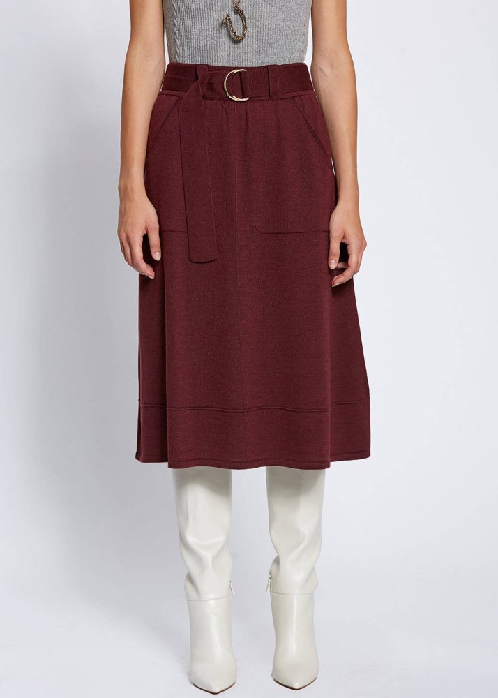 Belt Detailed Merino Wool Wine Knit Skirt