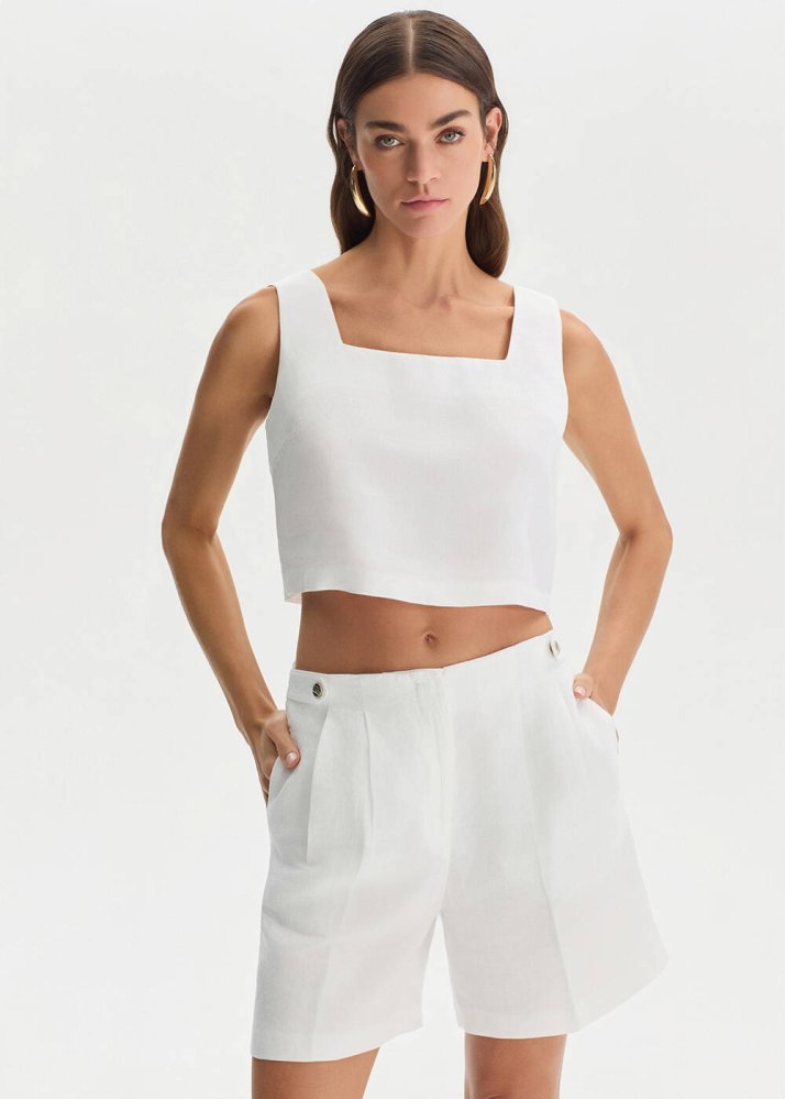 Beyaz Keten Crop Üst