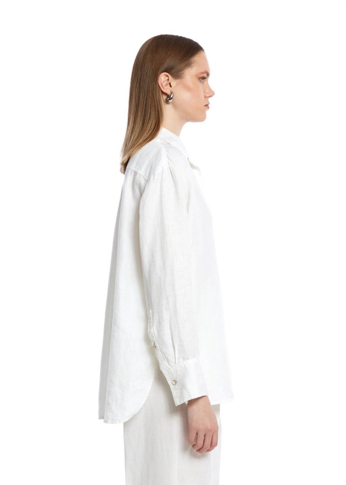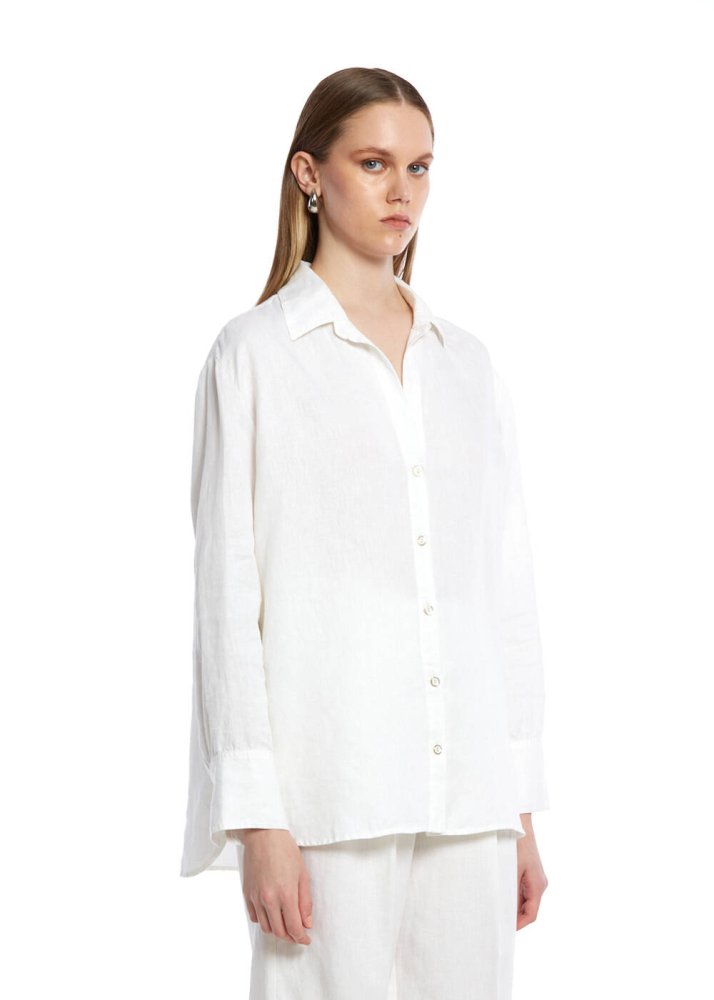 Saf beyazın asaletiyle tasarlanan %100 keten gömlek, özgün yapısı ve hafifliğiyle zarafeti ön plana çıkarıyor. Akışkan formu ve geniş manşet detaylarıyla sofistike bir siluet oluşturuyor. Aynı kumaştan tasarlanan pantolon ve şortla tamamlandığında, zamansız şıklığı modern bir dokunuşla yansıtıyor ve özgün bir yaz stiline dönüşüyor.