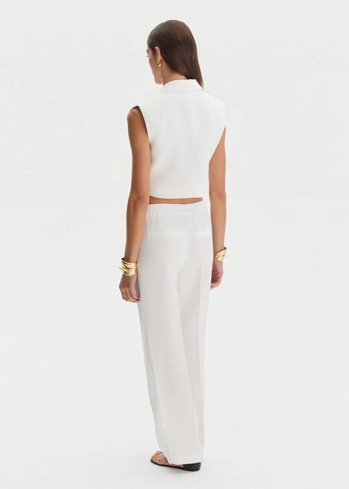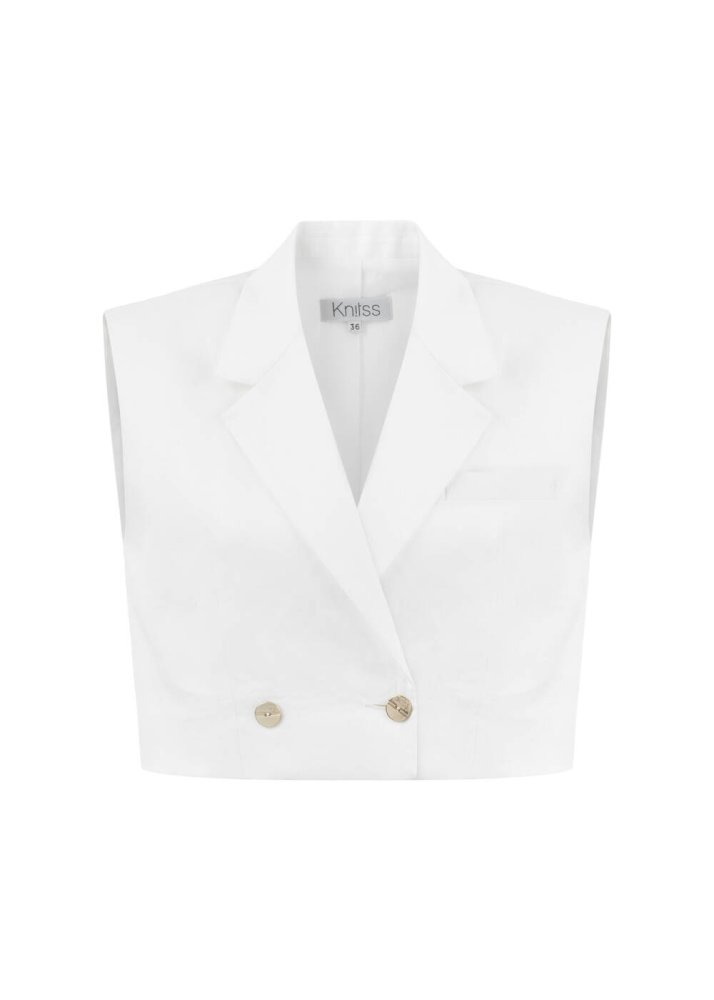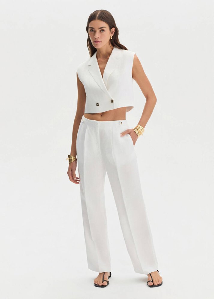 Yazlık ofis ve davet kombinlerine ayrıcalık katacak beyaz keten yelek, ceketi andıran çağdaş tasarımı ile dikkat çeker. Destekli omuzları, crop kesimi, kruvaze yakalı düğmeli tasarımı ve mükemmel kalıbı ile kusursuz görünüm sunan beyaz triko üst, minimal şıklığı çağdaş stille buluşturur. Saf ketenin konforunu ise her giyişte yaşatır.
