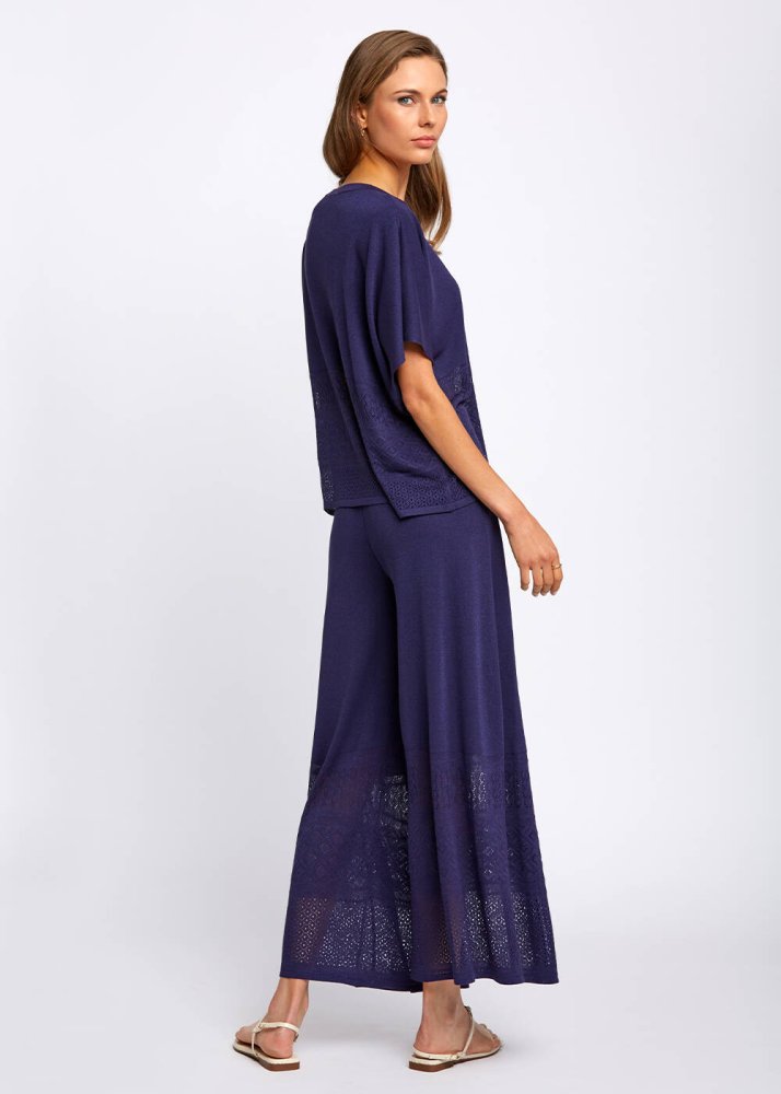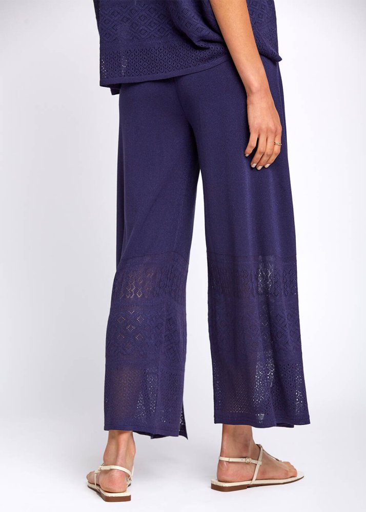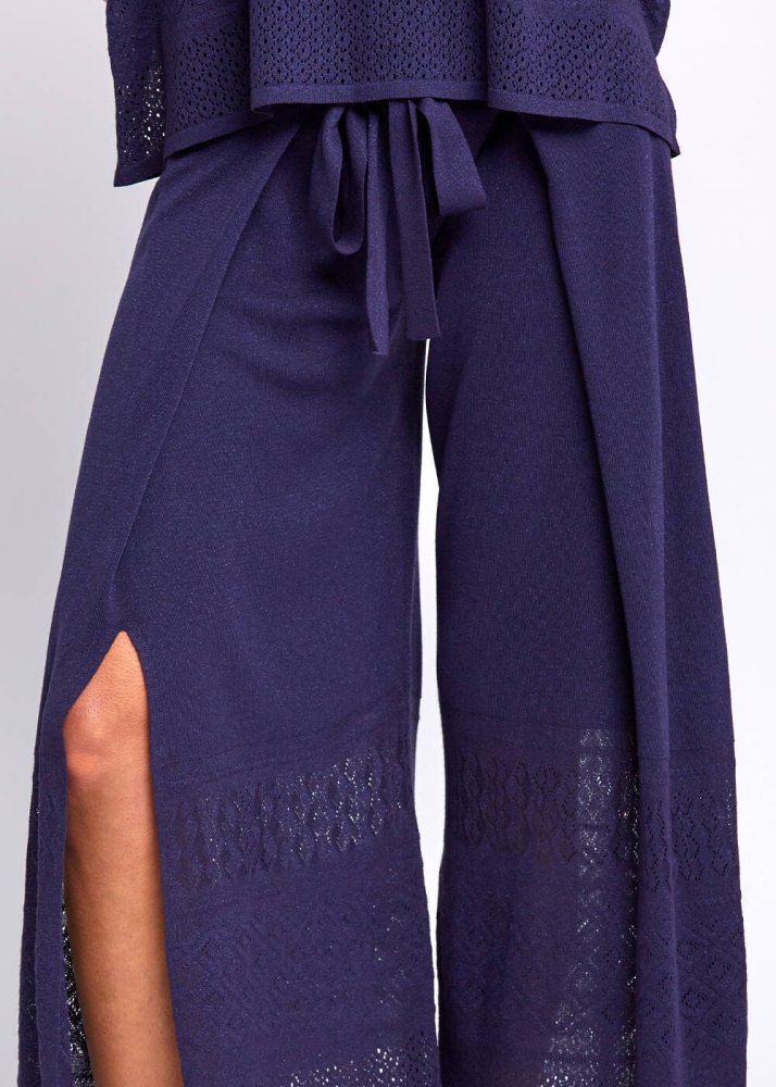 Bohem tarzın modern detaylarla buluştuğu lacivert triko pantolon ile Knitss şıklığını kombinlerinize taşıyın. Yürüdükçe açılan paça içi yırtmaca sahip kadın triko pantolon, belden bağlama ve paçalarındaki ajur detayına sahiptir. Crop triko pantolon, takımı olan Olivia Tops ile birlikte mükemmel bir uyum içerisindedir.