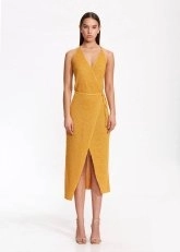 Sıcak yaz günlerinde favori giy-çık parçanız olacak Knitss triko elbise ile tanışın. Kruvaze yaka triko elbise modeli, ideal midi boyu ve yırtmaç detayı ile yaz stilinize şıklık katacak mükemmel bir parçadır. Sahil stilinize kolaylıkla uyum sağlayacak sarı triko elbise, geri dönüştürülmüş viskon ipliklerden üretilmiştir.