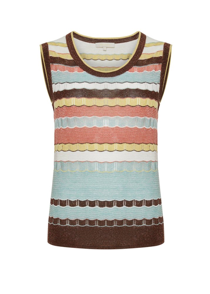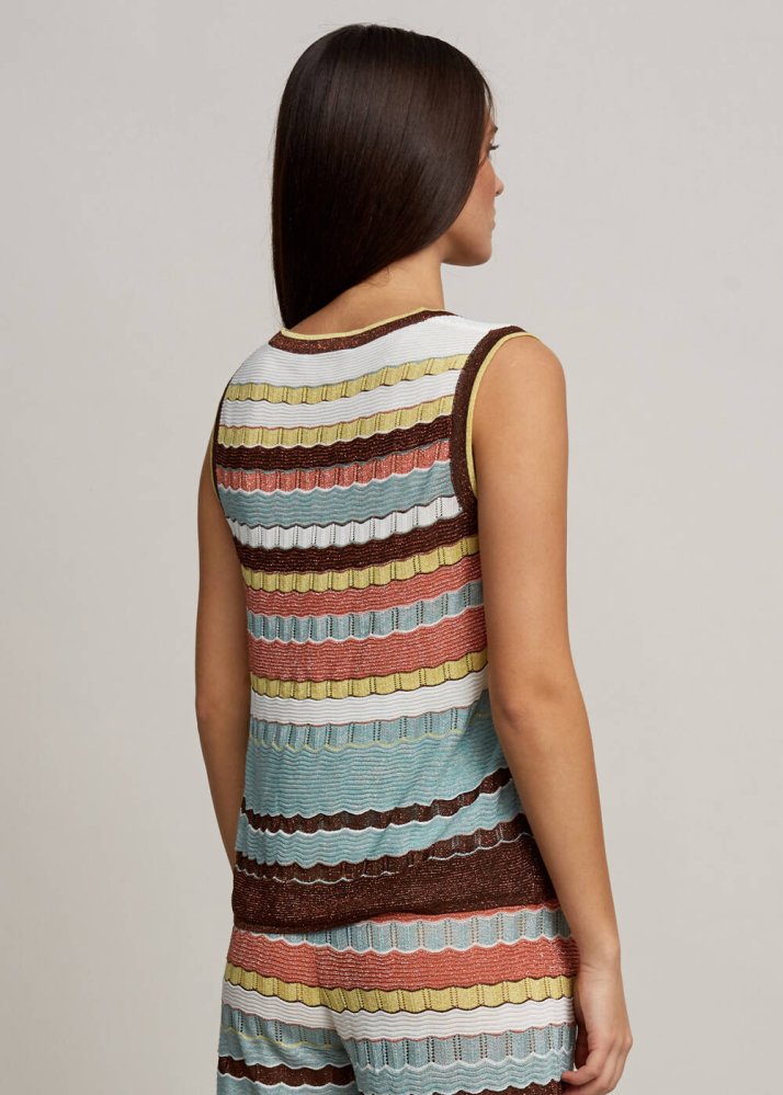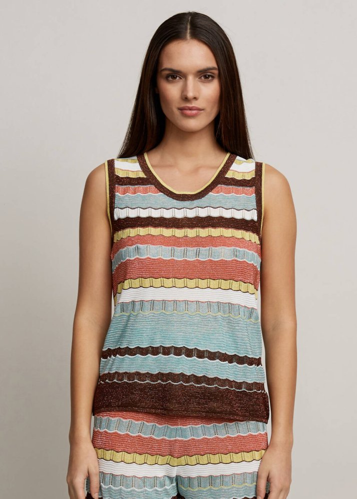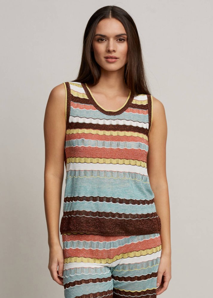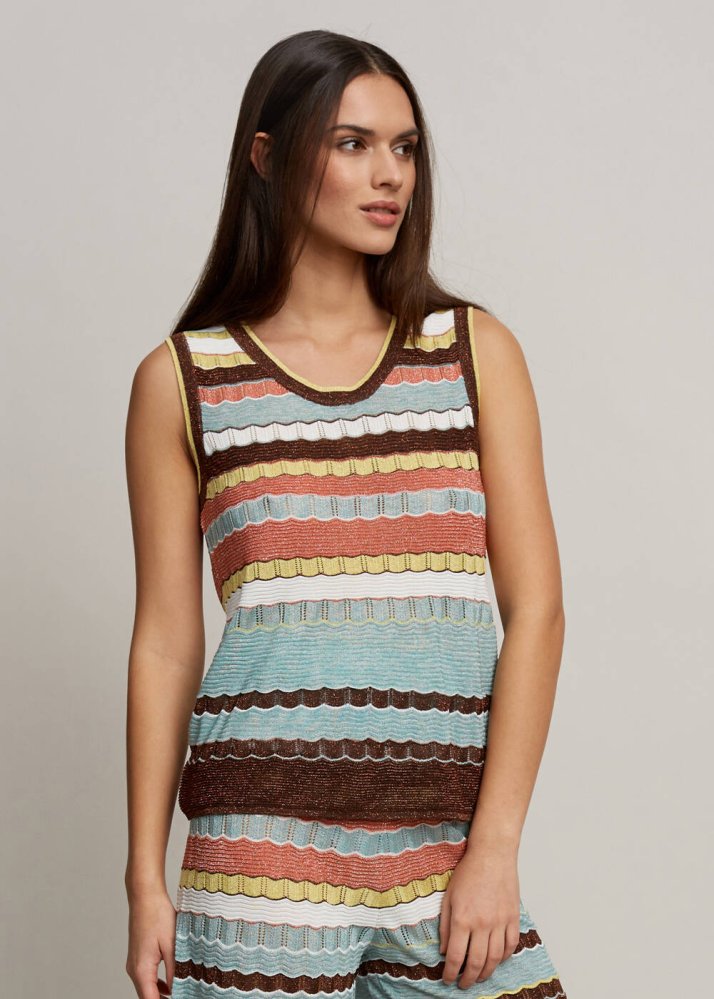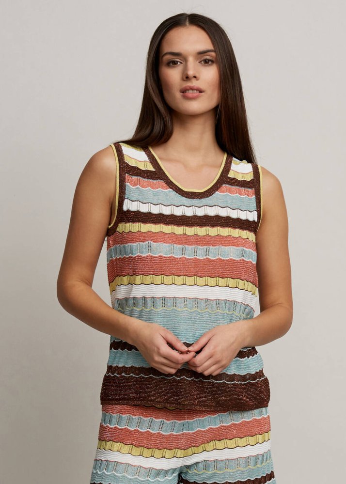 Ajur örgü dokusu ve çağdaş renk kullanımı ile dikkat çeken çizgili triko bluzu keşfedin. Yuvarlak yaka kolsuz triko bluz, yazlık kombinlerinize ayrıcalık katacak özel bir tasarımdır. Dünyadaki ormanların korunmasına yönelik testlerden geçen FSC belgeli İtalyan iplik içeriği ile ayrıcalıklıdır. Takımı olan triko şortla ya da birçok Knitss parçası ile rahatlıkla kombinleyebilirsiniz.