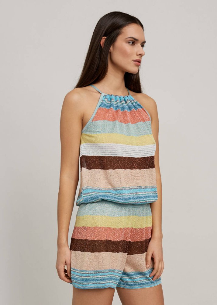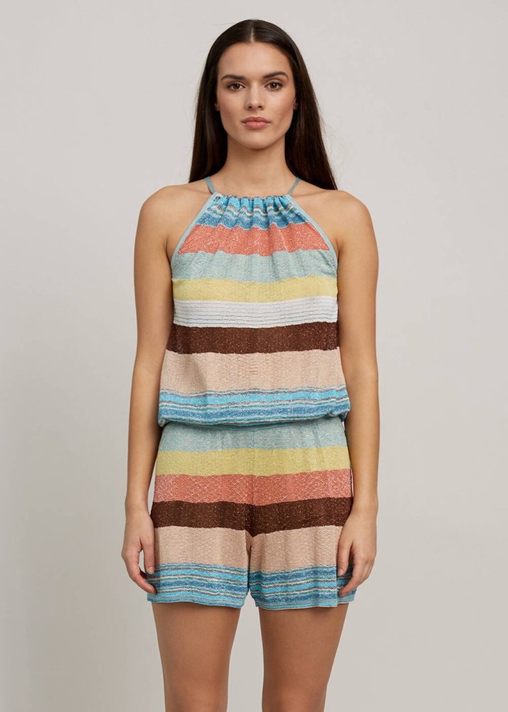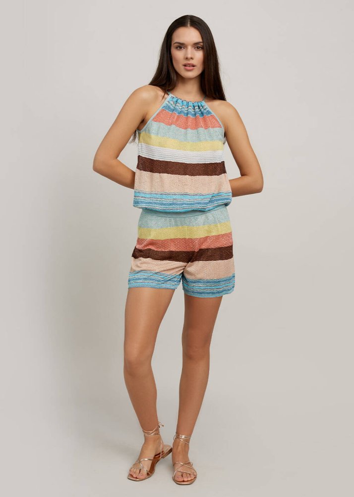 Çizgili Boyundan Bağlı Kısa Triko Tulum