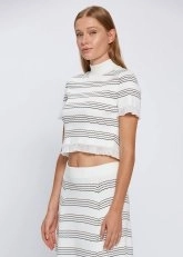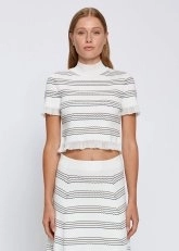 Çizgili ekru crop triko üst, hem günlük hem de özel gün kombinlere zahmetsizce uyan çağdaş stili ve Knitss’e özgü zarif detayları ile ayrıcalıklı bir stil vadeder. Kol ve etek uçlarındaki feminen dokunuşlarını zamansız çizgi deseni ile buluşturan ekru rengi crop triko üst, takımı olan uzun etekle sofistike bir giyim zevkinin özel bir parçasıdır.