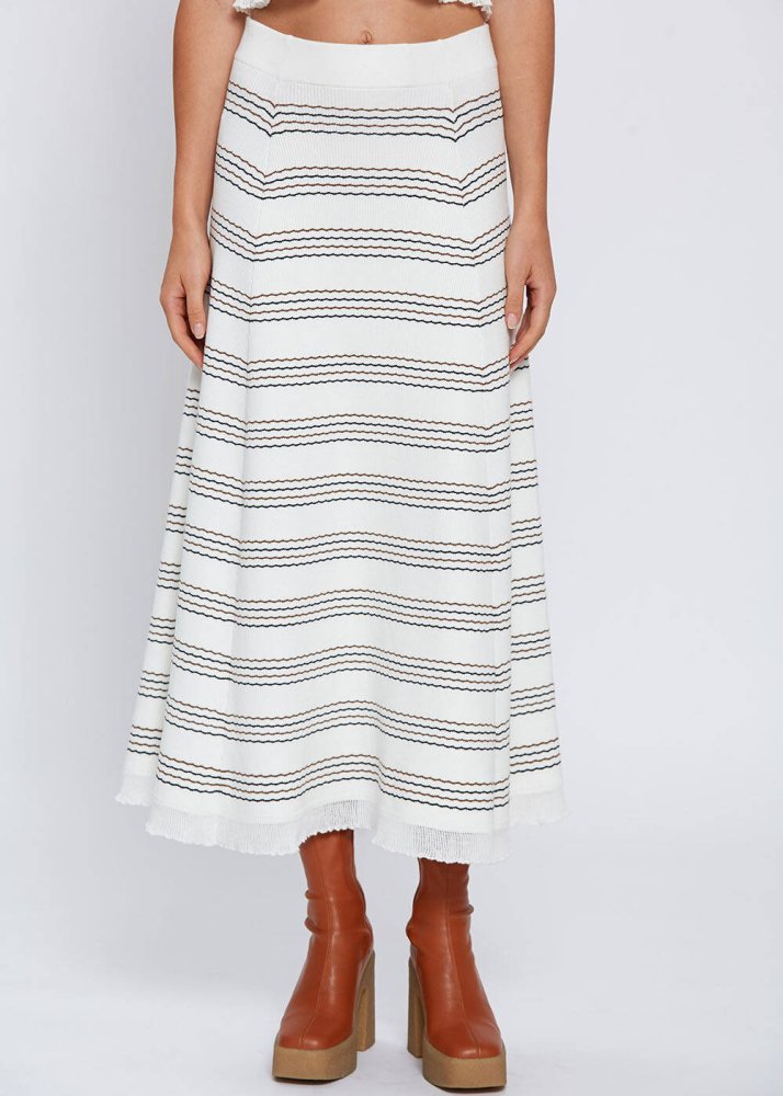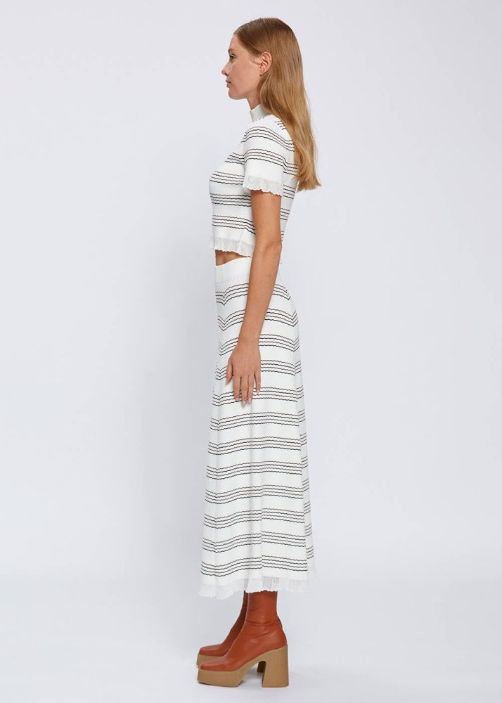 Konforun ön planda tutulduğu yenilikçi tasarımlarla trikoya yeni bir soluk kazandıran Knitss’in enine çizgili uzun beyaz eteği ile özgür ruhunuzu stilinize yansıtın. A kesim çizgili beyaz uzun etek, İtalyan iplik içeriği ile uzun ömürlü ve kalitelidir. Etek uçlarındaki detayları, takımı olan üstle birlikte tamamladığı çağdaş stili, konforlu elastik beli ile rahatlığı şıklıkla buluşturur.