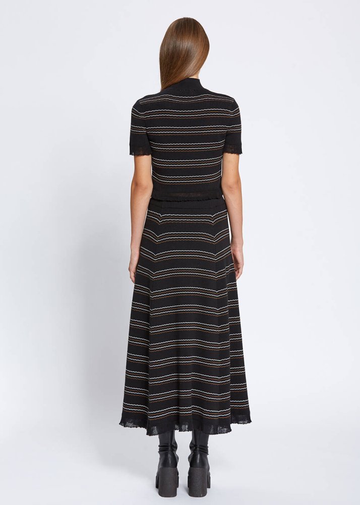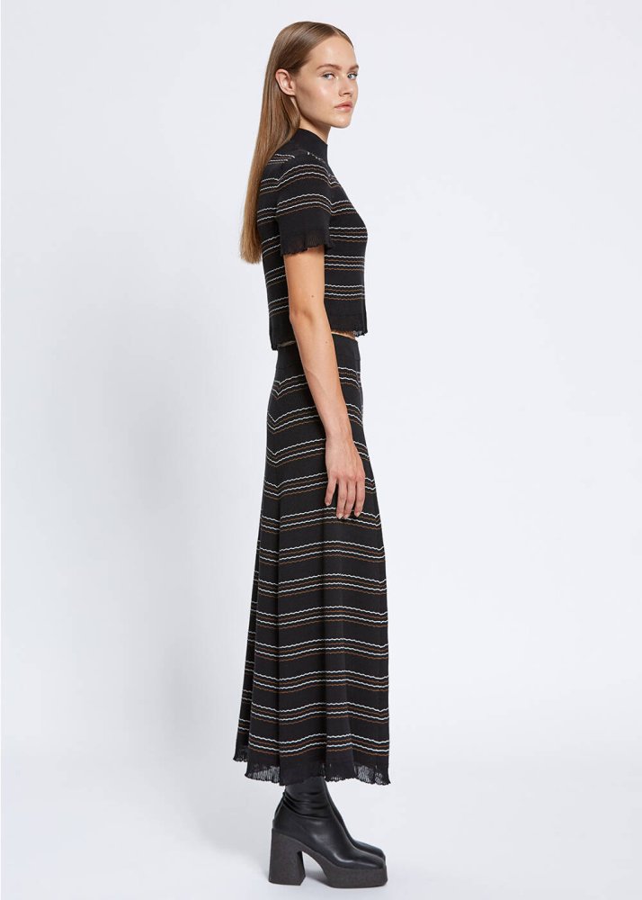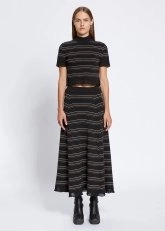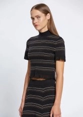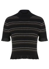 Çağdaş feminen stili ile fark yaratan yarım balıkçı çizgili siyah crop triko üst, kol ve etek uçlarındaki zarif detaylar ve Knitss’e özgü sofistike stili ile çok şıktır. Takımı olan uzun triko etekle özel gün kombinleri için yenilikçi bir tarz sunarken, denim pantolonlarla ve triko eteklerle de zahmetsizce eşleşir.
