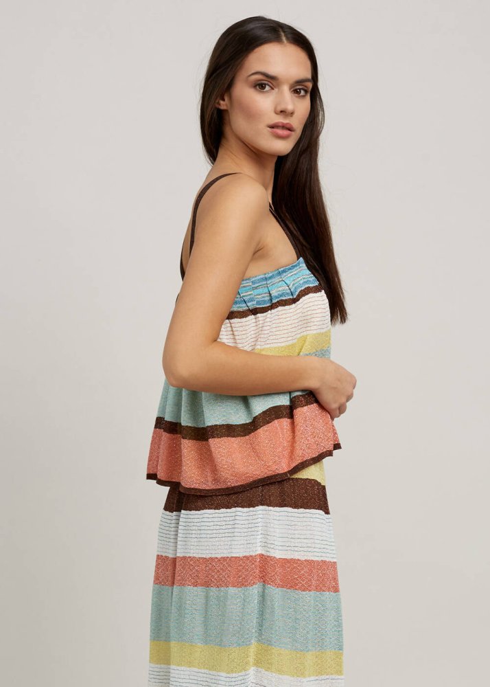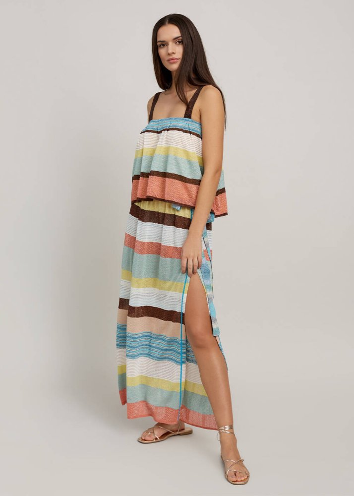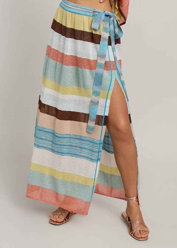 Çizgili uzun yazlık triko etek, yoğun tempoya sahip şehirli Knitss kadınının en sevdiği “giy-çık” giysilerinden olmaya adaydır. Rahat kalıbı, incecik triko örgü yüzeyi ile gün boyu konfor sunan belden bağlamalı çok renkli çizgili triko etek, FSC sertifikalı İtalyan viskon ipliklerinden üretilmiştir. Bu belge, eteğin dünya çapında ormanların korunmasına yönelik katı testlere uygun üretildiğini gösterir.