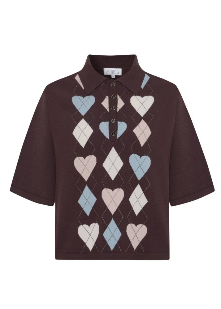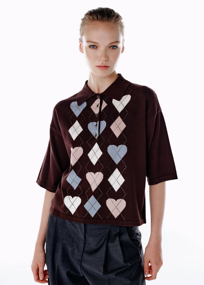 COFFEE HEARTED ARGYLE PATTERNED KNIT TOP