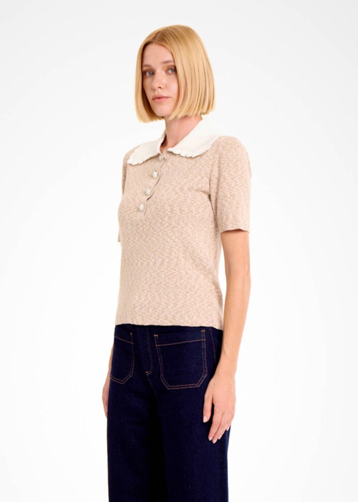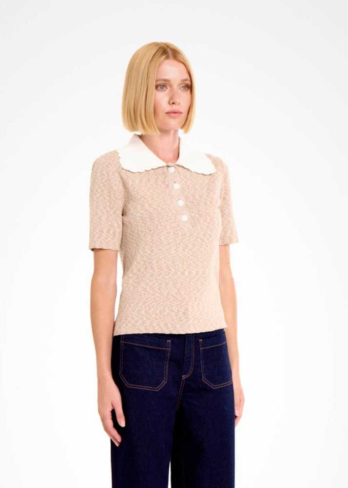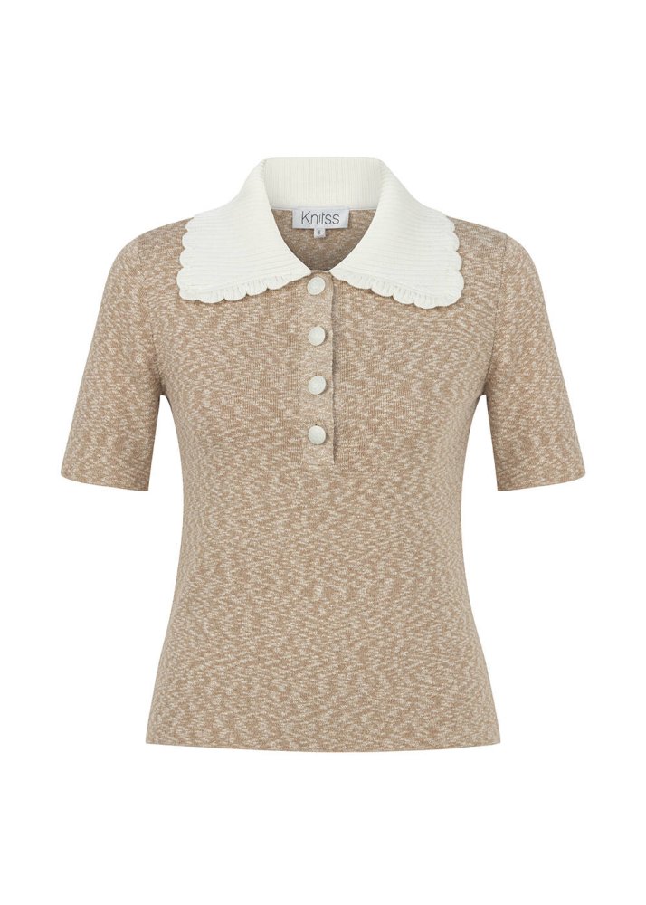 CONTRAST NECK CAMEL MOULINE KNIT TOP